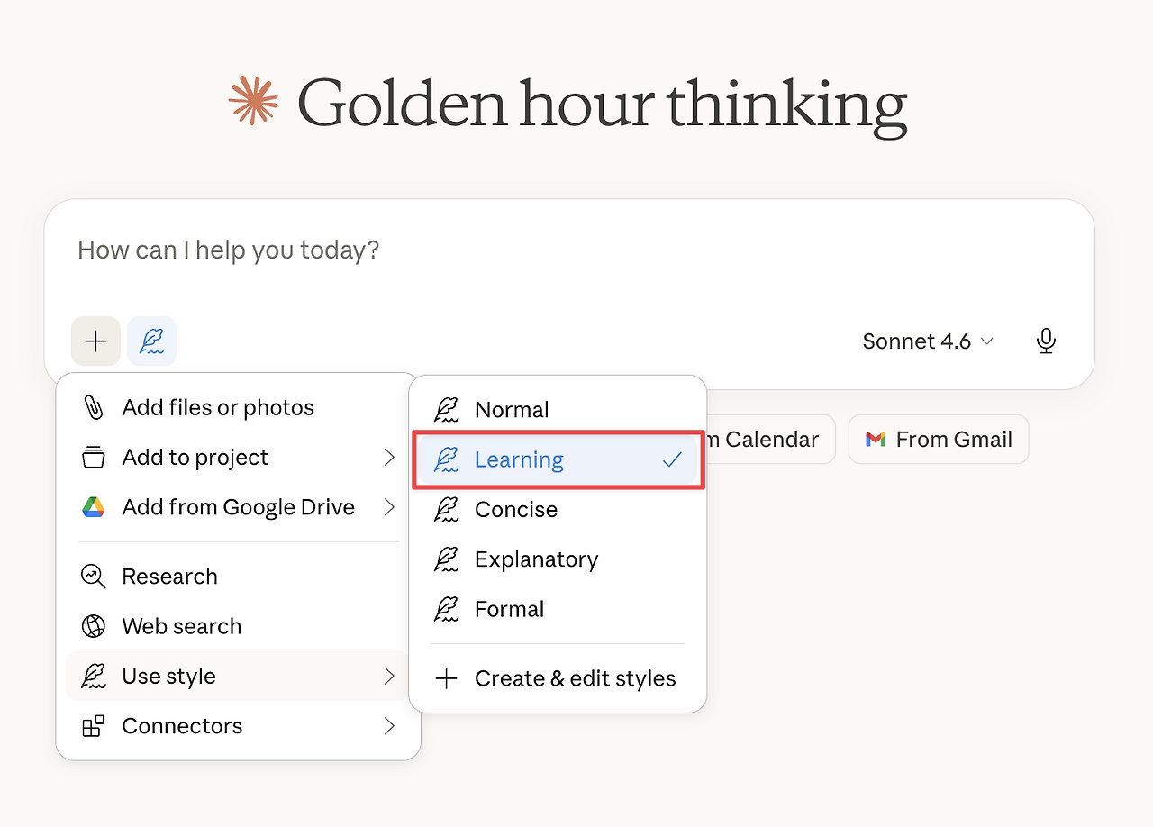 한 가지 더 최근 발견한 것이 있다. 클로드에 "Learning"이라는 설정이 있는데, 답을 바로 주는 대신 질문을 주고받으면서 실제로 가르쳐주는 방식이다. 몇 달 전이었으면 이걸 보고 "물어보지 말고 그냥 해줘"라고 생각했을 것이다. 하지만 지금은 완전히 이해가 된다. 핵심이 판단력과 이해력을 계속 키우는 것이라면, 답을 그냥 받아먹는 것이야말로 최악의 방법이다.