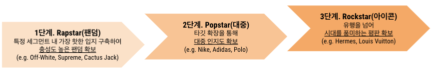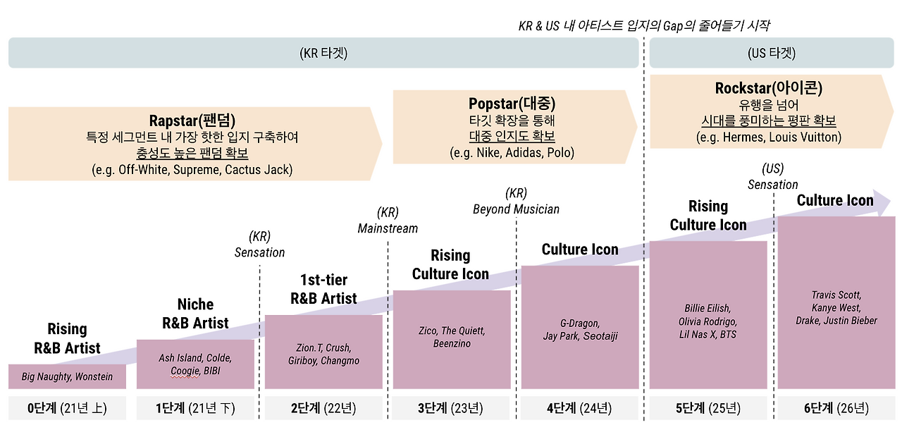 엔터 업계에서 일하면서 느낀 바, 성공하는 브랜드들은 필연적으로 3단계 Rapstar(팬덤) → Popstar(대중) → Rockstar(아이콘)를 거치며 성장한다고 생각한다. 이는 산업과 장르를 넘어 어느 브랜드에도 적용 가능하며, 세대가 지나도 변하지 않을 개념이라 생각한다.