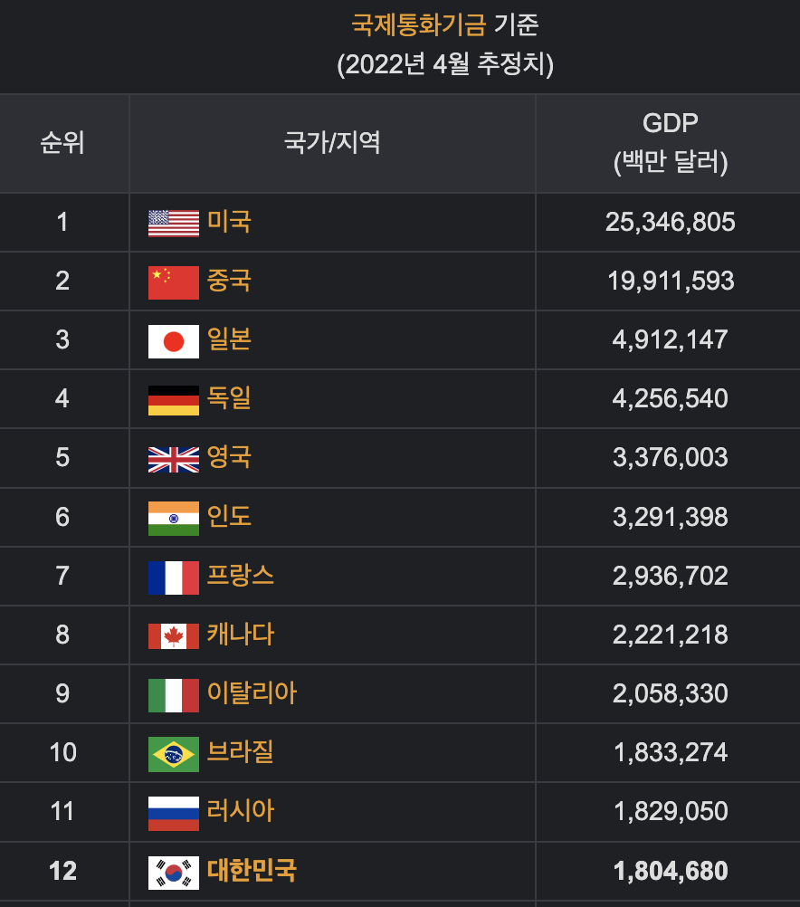 보통 선진국이라 하면 GDP(국내 총생산량)를 떠올리는데 비록 작년에 비해 2단계 내려왔지만 한국은 12위로 브라질, 러시아와 어깨를 나란히 하고 있습니다. Top 12 중 인구와 땅덩어리가 가장 작다는 점을 감안한다면 꽤 선방하고 있는 게 아닌가 싶네요.