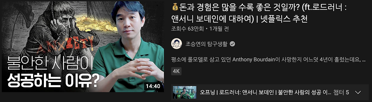 행복의 조건이란 무엇일까요? 돈, 명예, 경험, 성취감, 인정, 사랑, 관계 등 셀 수 없이 많습니다. 하지만 과유불급(過猶不及)이라는 말이 있듯이 아무리 좋아도 하나에만 몰두하는 것은 위험하다고 생각합니다. '엔서니 보데인'을 보았듯이 집착으로 인해 전체적인 '삶의 밸런스'가 무너질 수 있기 때문이죠.