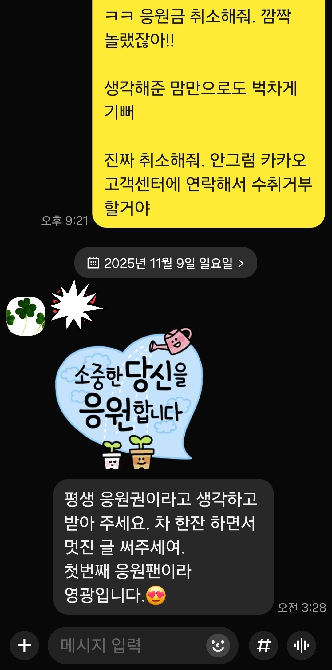 "아 응원이 돈 입금하는 건 줄 몰랐어. 이거 취소해 줘. 응원가득 마음만 받을게. 마음만으로도 충분히 감사해..."