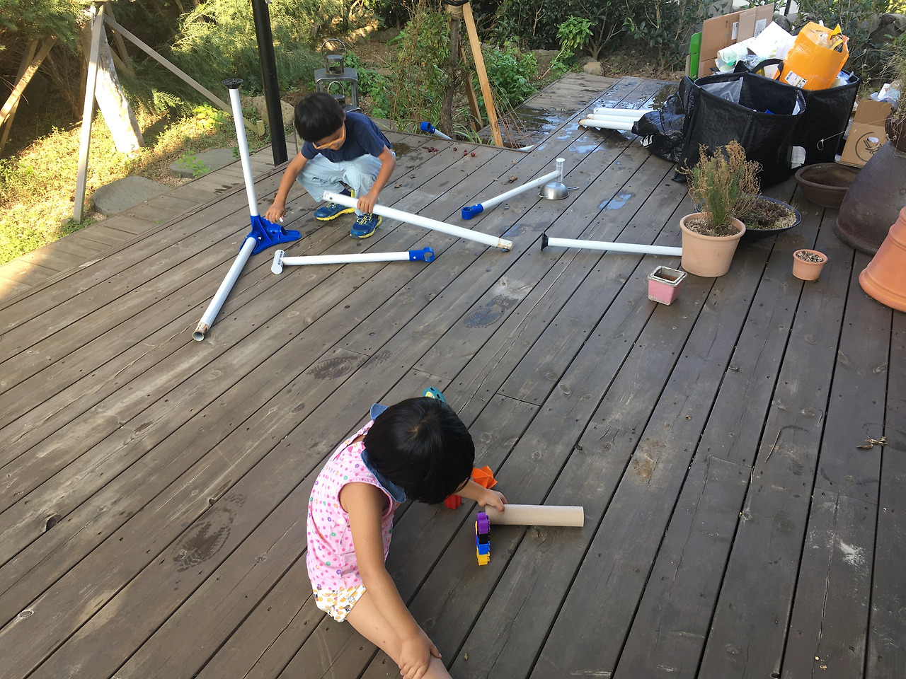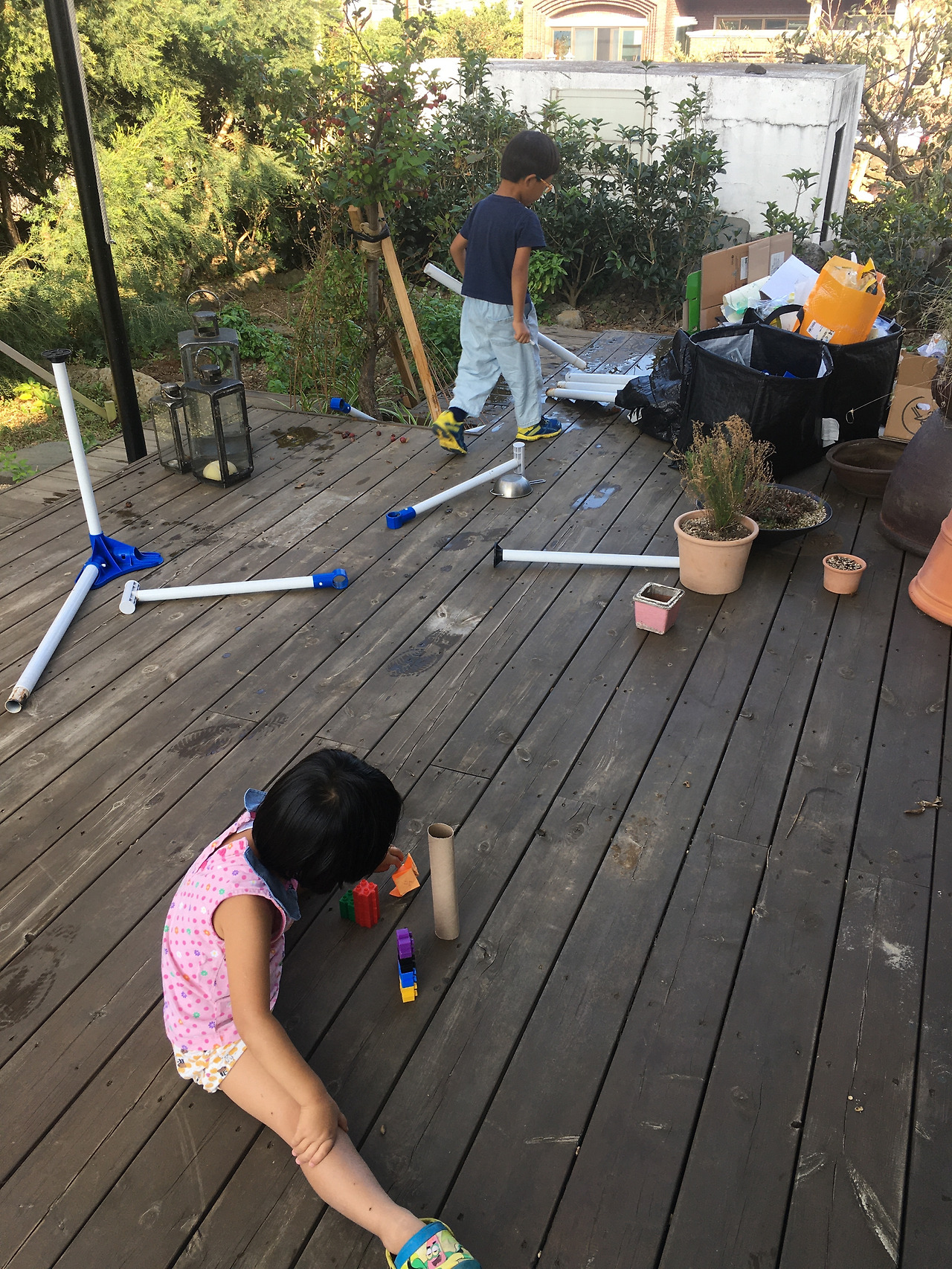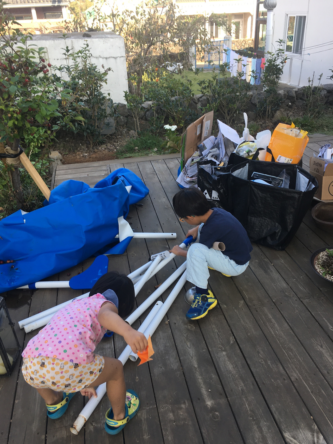 단 걸 먹어서 다시 기운을 차린 아이들을 데리고 마당으로 나왔다. 한 주간 밀려있던 재활용 쓰레기를 버리기로 했다. 태풍으로 망가진 뒤, 한 달간 흉물스럽게 방치돼있던 야외 풀장도 겸사겸사 해체해서 버리기로 했다. 은우에게 풀장 해체를 부탁하고 다용도실에서 재활용 쓰레기를 꺼냈다. 쓰레기를 차에 싣고 한참 뒤에 가보니 철과 플라스틱을 분리해서 가지런히 모아놓은 은우. 은우는 정말 일을 똑소리 나게 잘한다. 그리고 옆에 앉아서 블록으로 장난하고 있는 유민이. 어쩜 이렇게 한결같니.