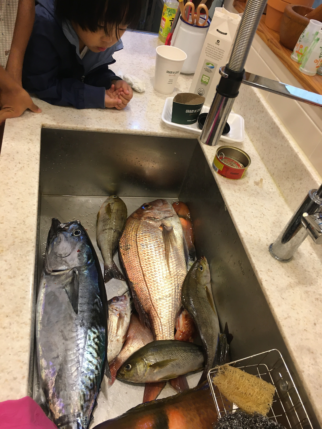 생일파티를 마치고 부엌으로 가서 만반의 준비를 하고 생선 손질을 시작했다. 비늘 벗기고 내장 따는걸 옆에서 꼭 보겠다는 유민이.