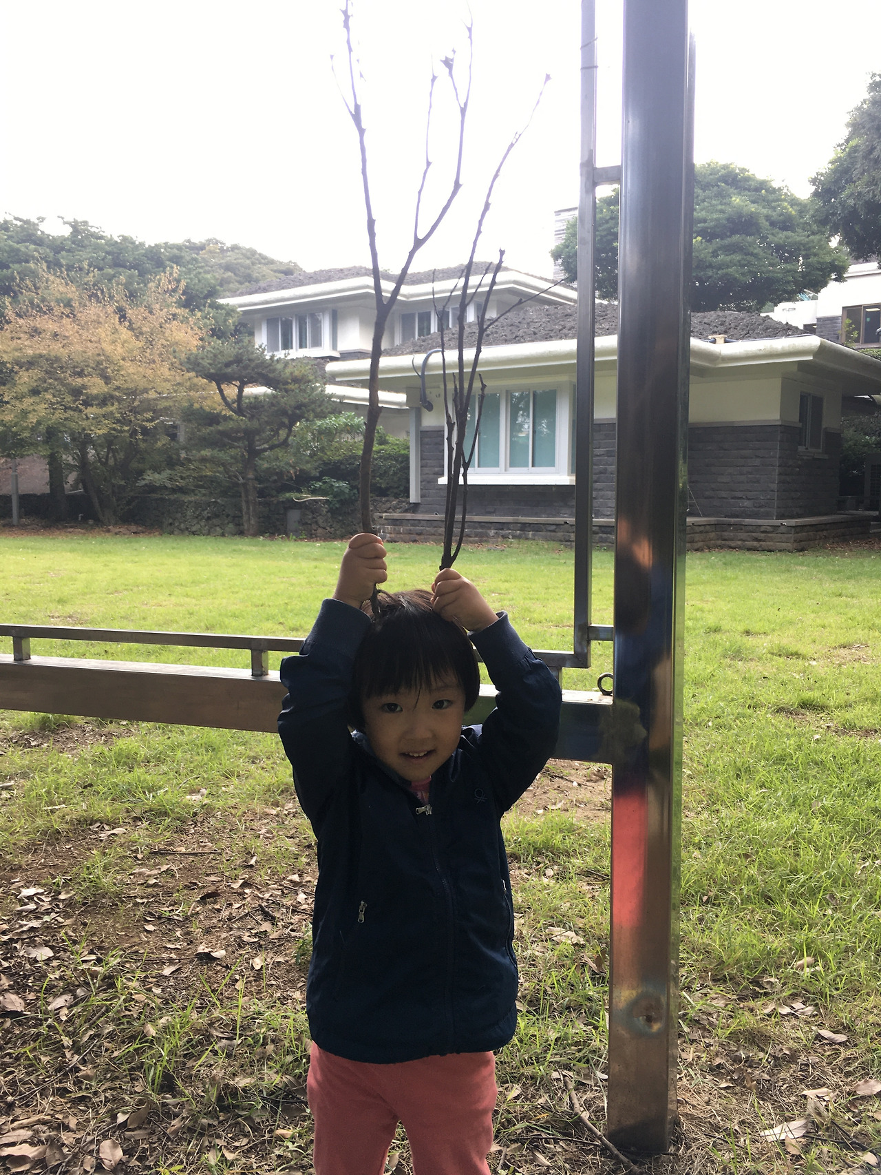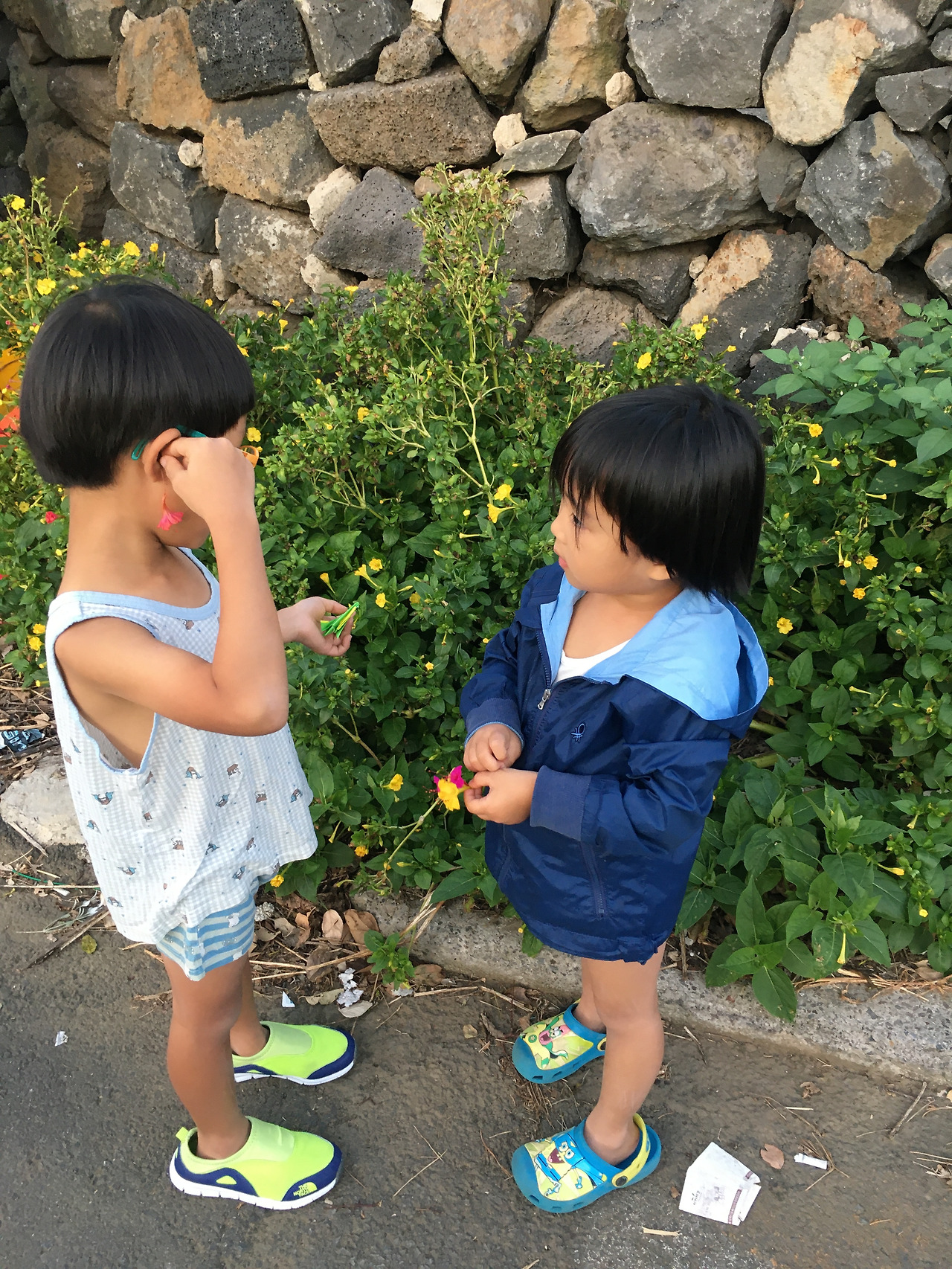 집 근처 큰 길가 도로에서 길가에 핀 꽃 들을 따서 꿀을 빨아먹고 귀걸이를 만들며 노는 아이들. 나무에 거미줄을 치고 있던 다리가 하나 없는 거미가 거미줄에서 연신 미끄러지니 유민이는 힘내라며 응원을 시작했다. 큰 길가에서 내복만 입은 두 아이가 노는 모습을 지나가던 버스의 승객들이 흐뭇하게 바라보며 웃었다.
