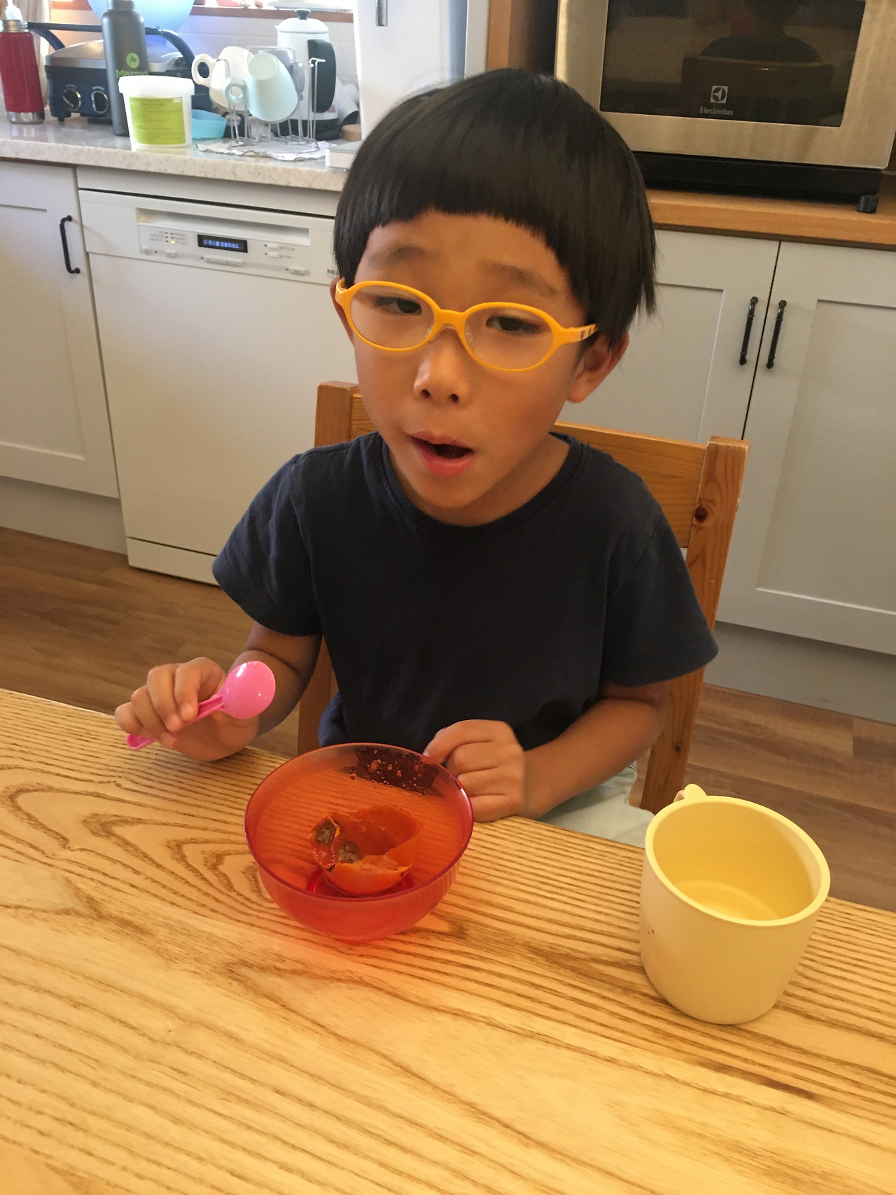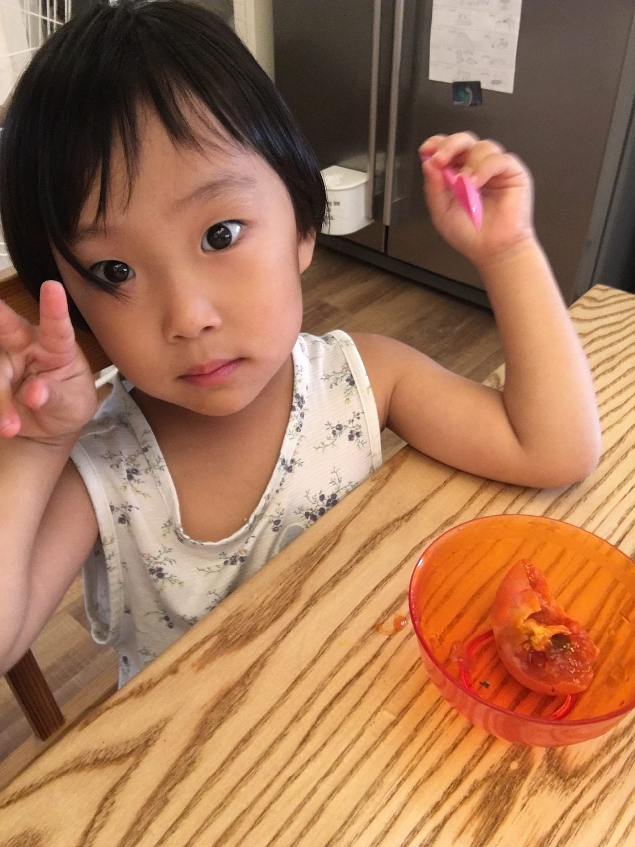 열심히 일을 했더니 당이 떨어졌는지 홍시가 먹고 싶다는 은우. 하나를 나눠서 은우랑 유민이에게 나눠주었다.