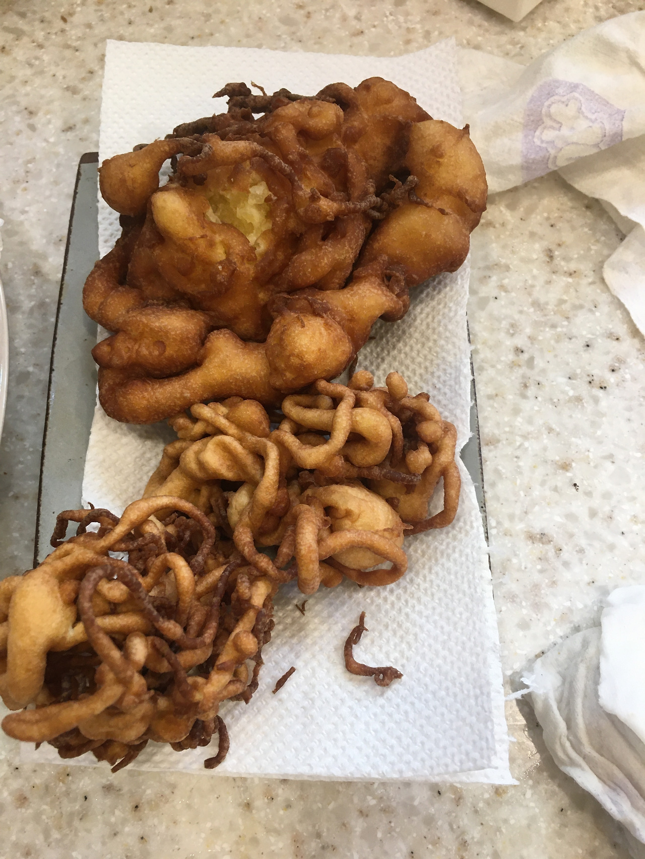 반죽이 좀 남았는데 버리기 아까워서 길게 늘어뜨려서 튀겼다. 구불구불한 모양을 보니 유민이가 말한다.