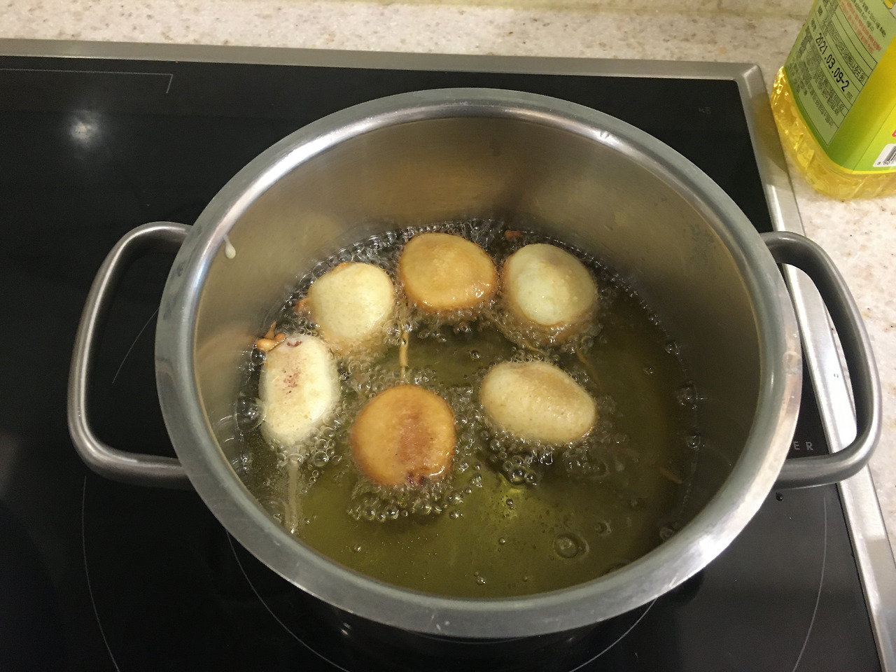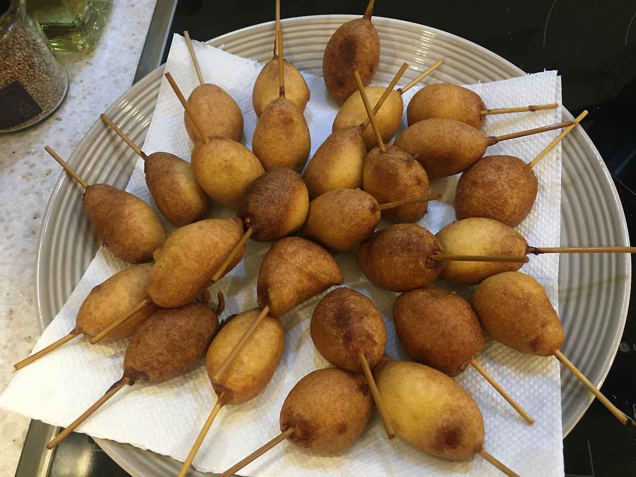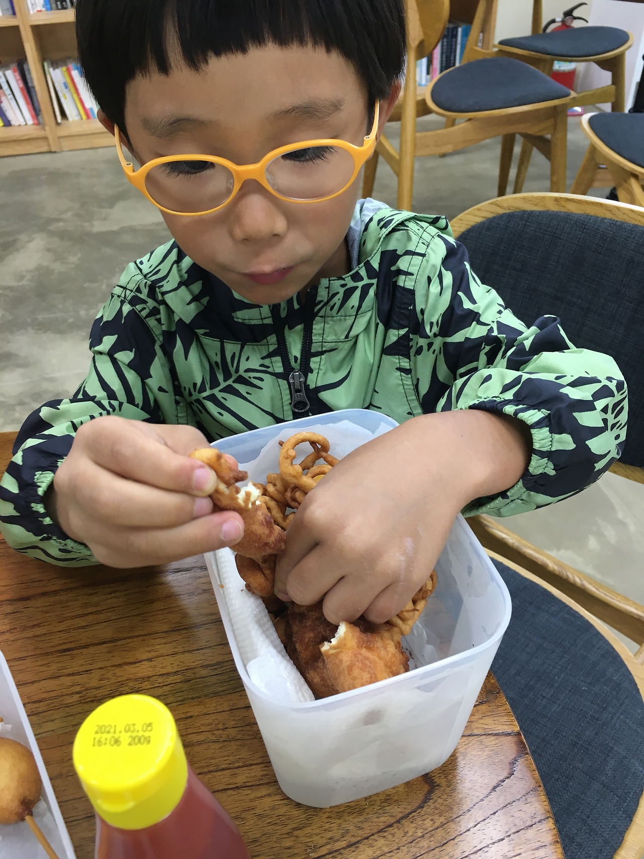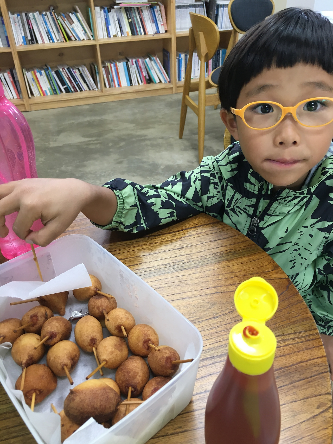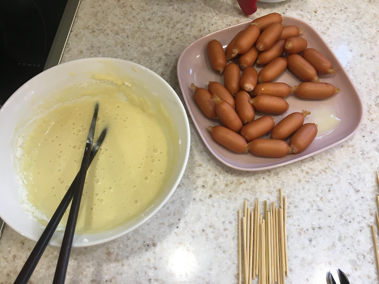 결국 빵가루는 찾지 못했다. 다시 마트에 가기도 귀찮아서 그냥 은우에게 양해를 구하고 폭신한 일반 핫도그로 만들기로 했다. 핫도그가 기름에 튀겨지면서 고소한 냄새가 풍기자 놀고 있던 은우와 유민이가 와서는 구경한다. 둘 다 연신 ‘와! 진짜 맛있겠다!’를 연발한다. 핫도그 더미에서 하나씩 집어서 줬다.