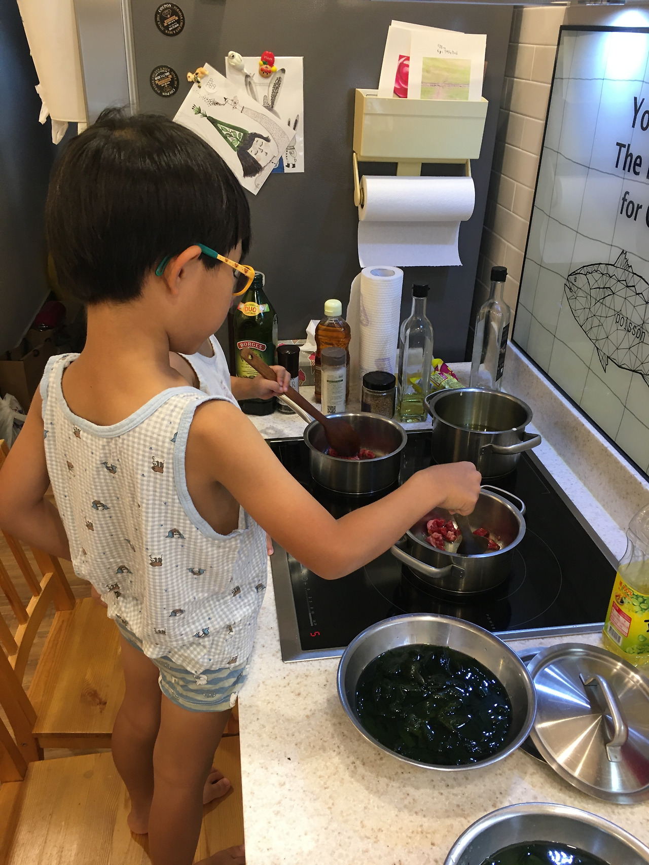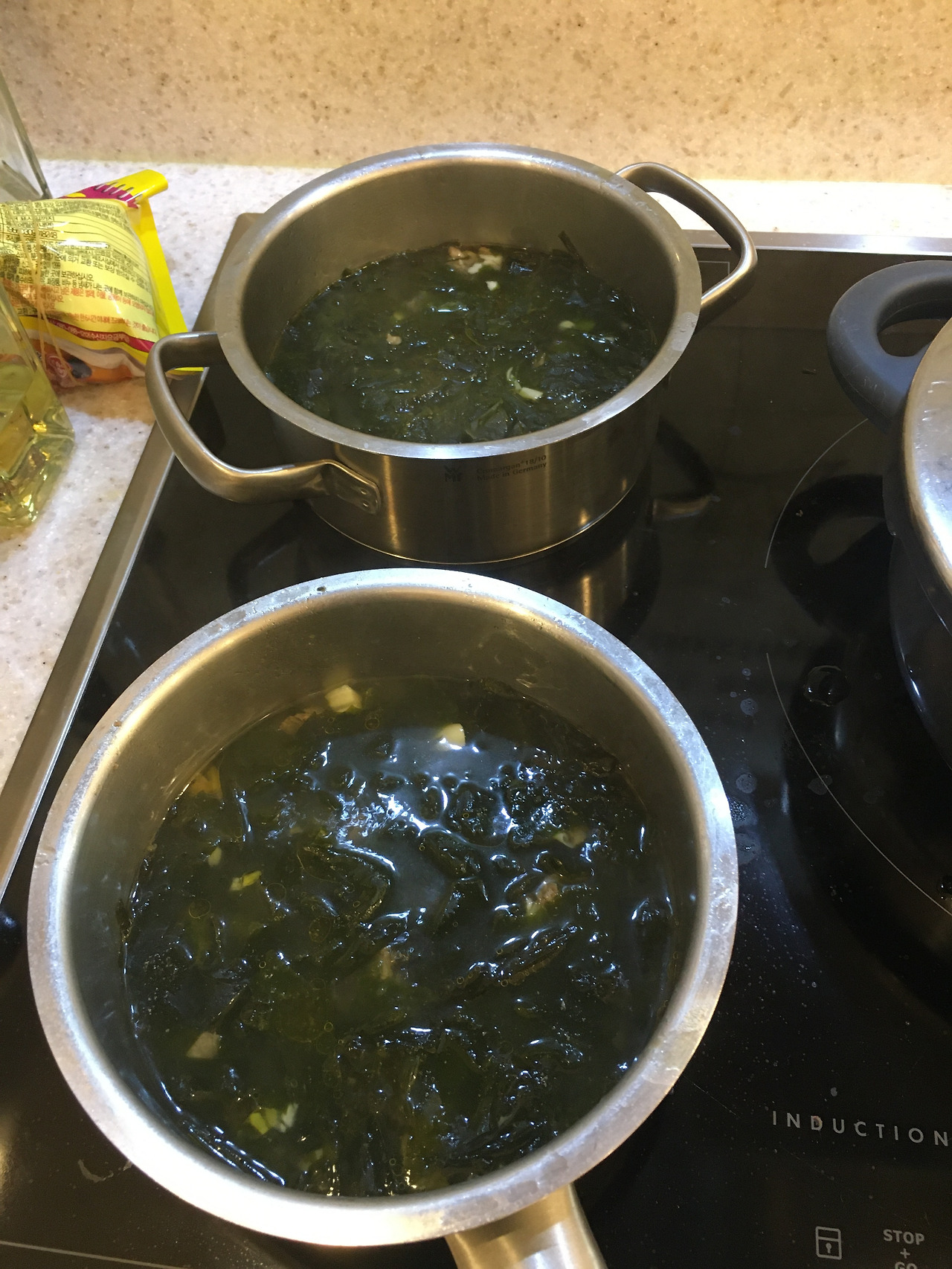 저녁에는 미역국을 끓이는 법을 가르쳐 줬다. 서로 하겠다고 싸울까 봐 애초에 냄비를 두 개를 놓고 각자 먹을 건 각자 만들기로 했다. 그런데 소고기를 볶던 유민이는 5분도 안돼서 흥미를 잃고 주저앉았다.