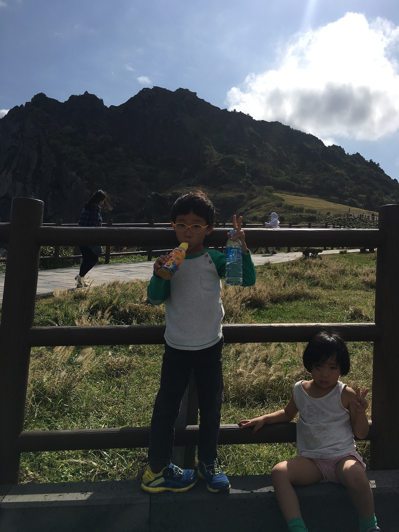 차를 돌려 성산일출봉으로 향했다. 평일인데도 인파가 장난이 아니었다. 수학여행 온 버스도 많았고 관광객도 많아서 주차장에 차를 댈 곳이 없었다. 30분이 넘게 주차장을 돌다 보니 다들 지쳤다. 강한 의지를 보이던 은우마저 포기하고 돌아가려는 찰나, 마침 빈자리가 나서 얼른 주차를 했다. 차에서 내려보니 바람이 차갑다. 유민이에게 겉옷을 입히려 하는데 절대 안 입겠다고 버티는 유민이. 기어코 민소매 티에 팬티만 입고 길을 나섰다. 엄마 없는 티가 너무 나는 우리 아이들. 부끄러움은 항상 아빠 몫인 거니..