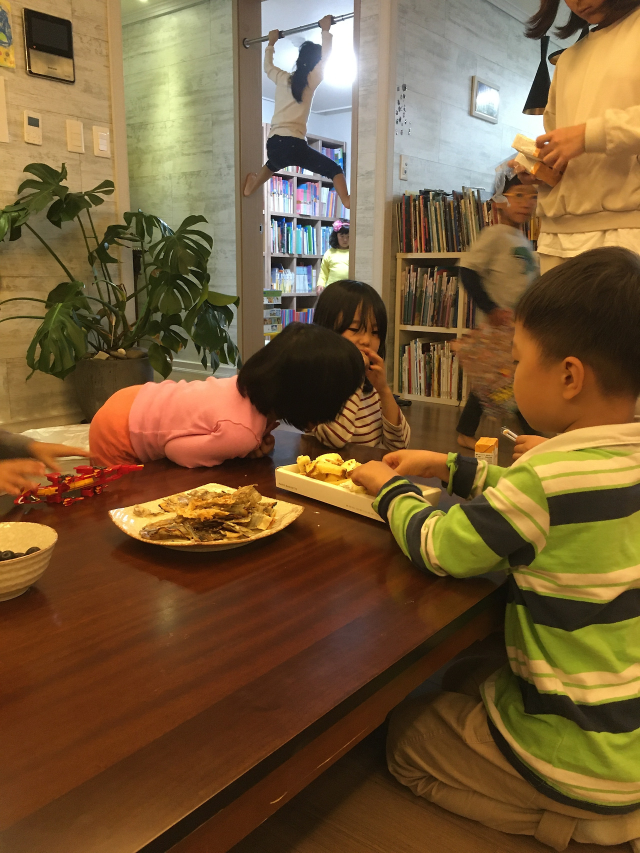 정신없이 떠들다 보니 어느새 승은이네 집에 도착했다. 승은이네 집은 아파트였는데 도착해보니 이미 집은 '혼돈의 카오스' 상태였다. 다행히 아래층에 사시는 할머니, 할아버지께서 층간소음에 대해 너그럽다고 하신다. 은근슬쩍 집 구경을 했는데 승은이네 집은 책이 참 많았다. 그냥 많은 게 아니고 작은 도서관 규모는 될 정도로 엄청나게 책이 많았다. 특히 한쪽에는 육아와 교육에 대한 책들이 꽂혀있었다. 책들을 훑어보면서 육아에 관심이 많은 부모들이 모이게 된다는 점도 공동육아 어린이집의 장점이라는 생각이 들었다.