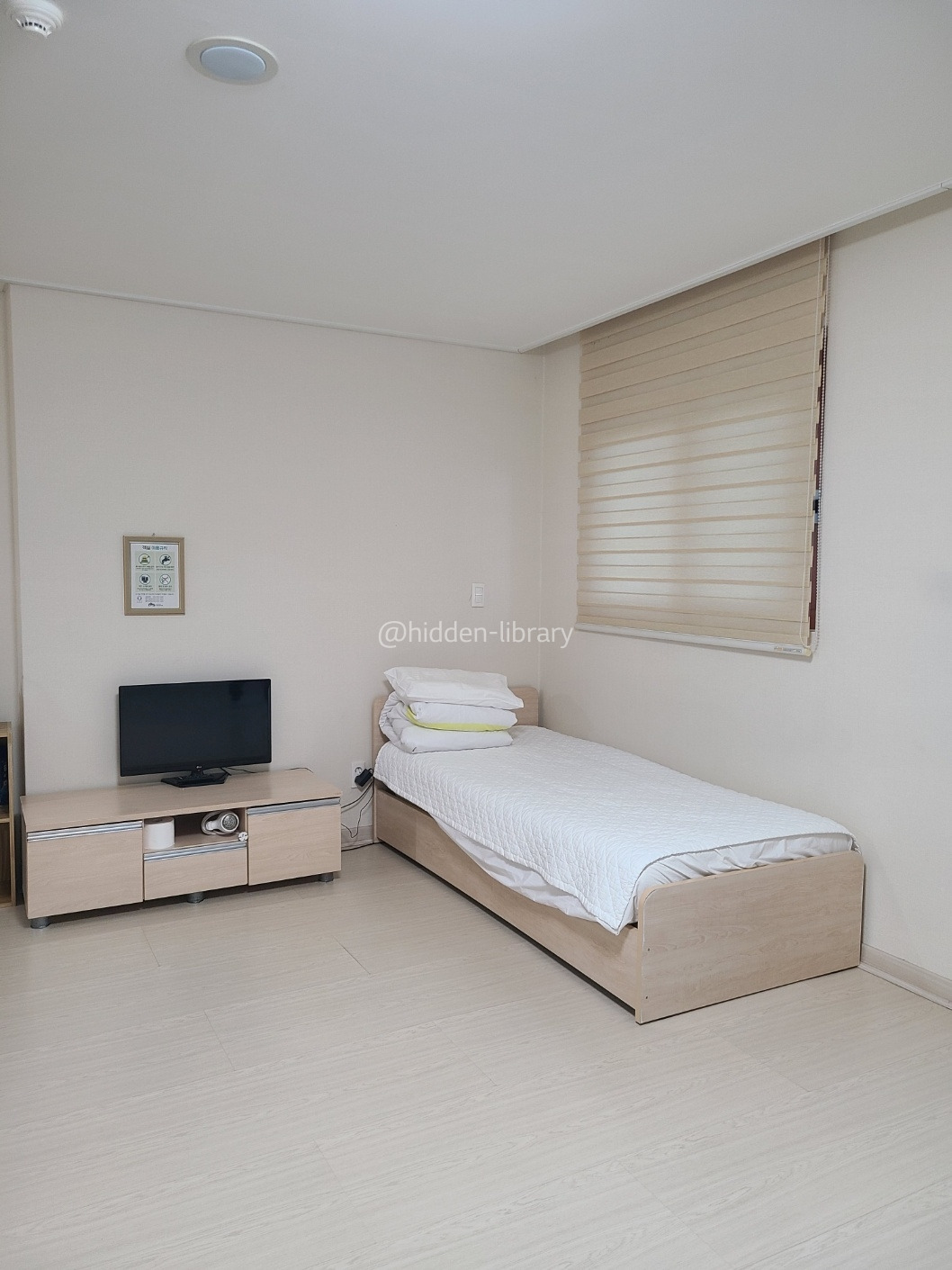넓은 방에 놓인 좁은 침대는 매트리스가 너무 물러 어지간한 사람이라면 잠자리가 불편할 수 있다. 이불장에는 추가 침구가 충분하지만, 수건 등 개인 세면도구는 직접 챙겨가야 한다.