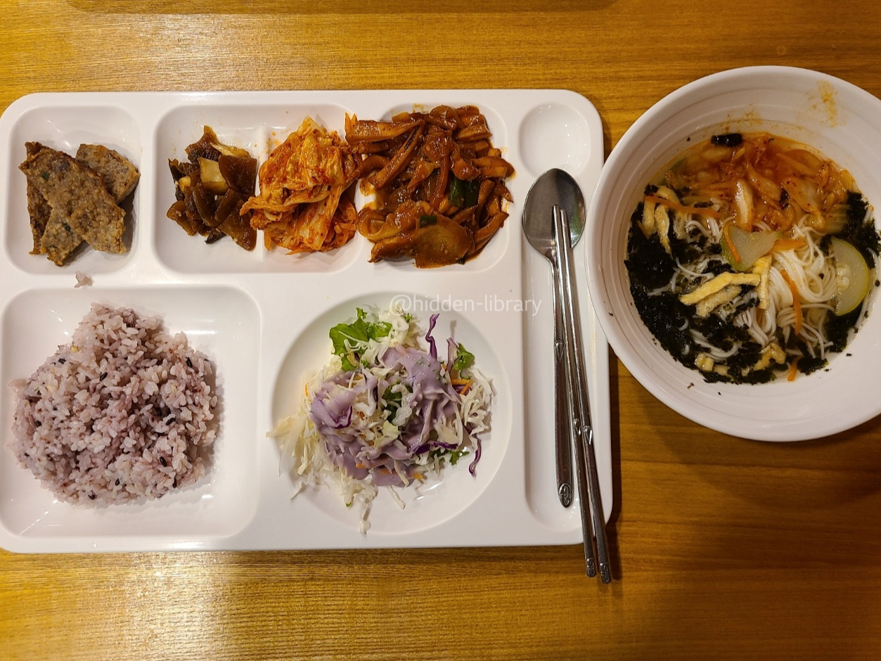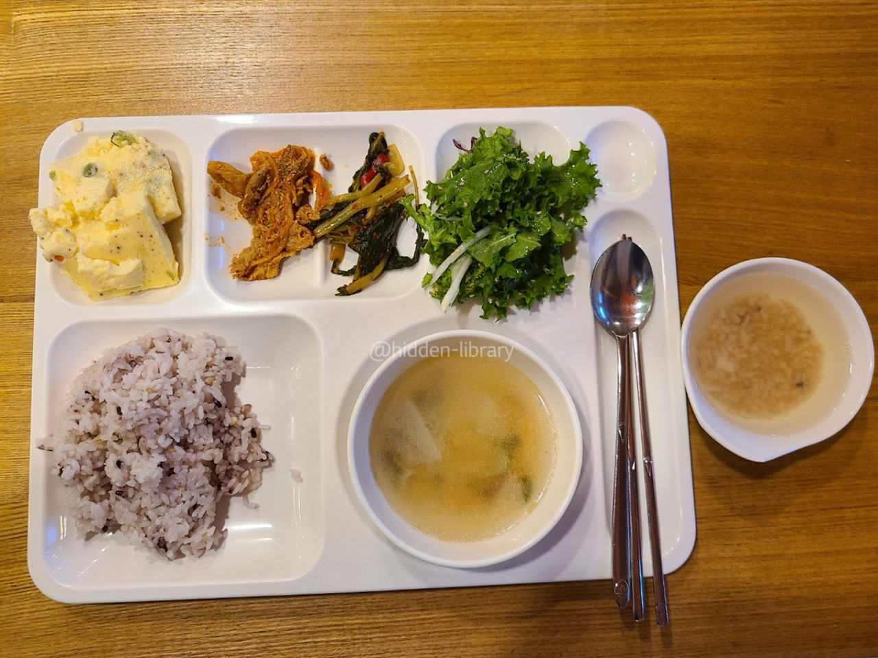 저녁과 다음 날 아침 식사는 치유동 옆 식당에서 해결했다. 숙박과 함께 한 끼에 8천 원으로 미리 예약해야만 이용할 수 있다. 산림치유 음식으로 차려준다는 밥상을 기대했지만, 흔히 보는 인스턴트형 급식이 제공되고 있다.