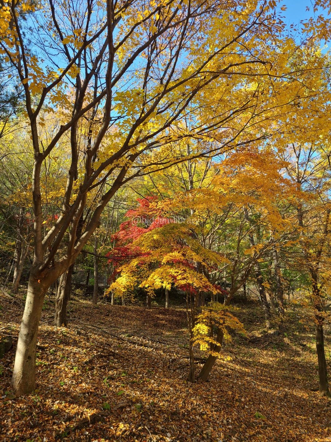 두려울 만큼 캄캄하던 곳에 빛이 내리니 이렇게 아름답다. 가시광선은 우리에게 얼마나 절대적인가. 최소한 태양신을 모시던 인류 역사의 일부를 이해 못 할 이유가 있을까. 산속에서 기지개를 켜며 느린 걸음을 옮기며 아직 남은 가을을 마신다.