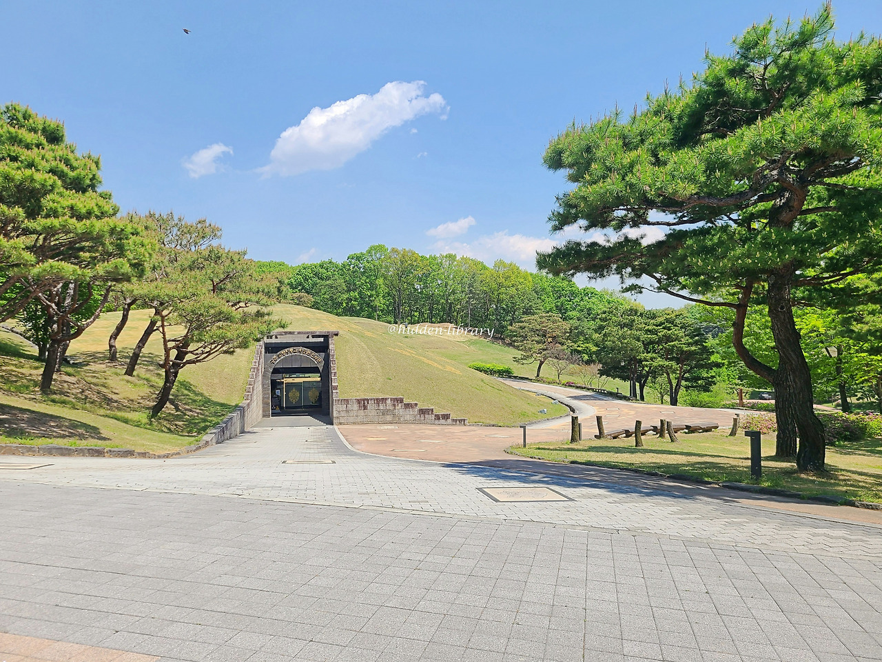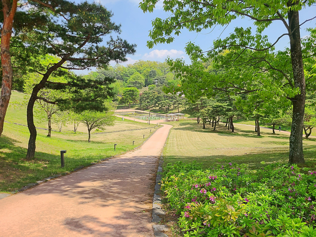 이곳에 닿자마자 푸르게 솟아오른 봉분들의 나지막한 언덕이 나를 맞는다. 잘 정돈된 잔디와 색색의 꽃잔디가 평화로워 보이지만, 그 고요함 속에는 작은 아쉬움 하나가 그림자처럼 드리운다. 보존을 위해 진짜 왕릉 문이 여전히 굳게 닫혀 있다는 사실 때문이다.