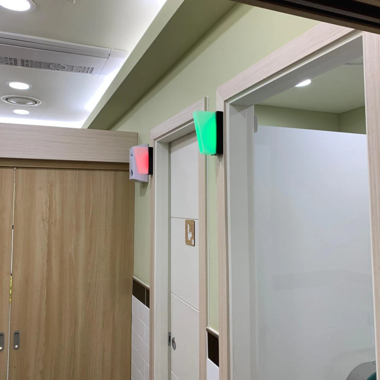 좌의 사례는 미적 인테리어 디자인 언어에 맞추다 보니 형성된 새로운 신호체계이다. 불이 켜진 것은 사용 중, 불이 꺼져 있는 것은 비어있음. 이는 우선 첫째로 새로운 약속을 학습해야 한다는 측면 단점이 있다. 둘째로는 무의식에 입각해 눈에 띄는 것만 말했을 때 당장 눈길이 가는 것은 불빛이 켜져 있는 쪽이다. 마치 급한 사람에 한줄기 희망의 빛을 주는 것 같은 느낌이랄까? 물론 살짝 열려있는 문을 보고 찾아가기도 하지만 그간 공항 근무를 하면서 오히려 빛을 보고 찾아갔다가 차있는 화장실 칸에 당황한 이용자들을 많이 보면서 '유도'의 측면에서는 대다수가 공감하지 못하는 디자인이라는 생각을 했다.
