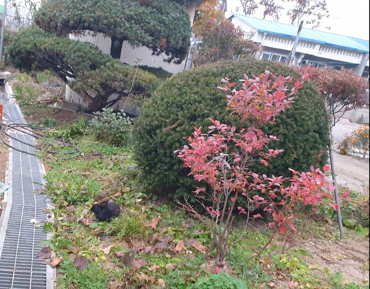 아무튼 나는 아래 아랫집으로 달려갔다. 할아버지는 마당 한편에서 텃밭을 정리하고 계시고, 할머니는 밭에서 뽑아오신 총각무를 다듬고 계셨다. 그리고 그 옆에 천연덕스럽게 쵸코가 풀을 뜯어먹고 앉아 있었다. 급한 마음에 떨리는 손으로 카메라를 들어 쵸코를 담았다. 두 어르신과 나는 쵸코를 잡아보려고 했지만, 깡충깡충 바로 눈앞에서 폴짝폴짝 어찌나 빠르게 뛰는지 도무지 잡을 수가 없었다. 마당 한가운데 소나무 아래로 숨더니 한참을 있다가 다시 유유히 마당으로 나와 풀을 뜯어먹는 쵸코!!