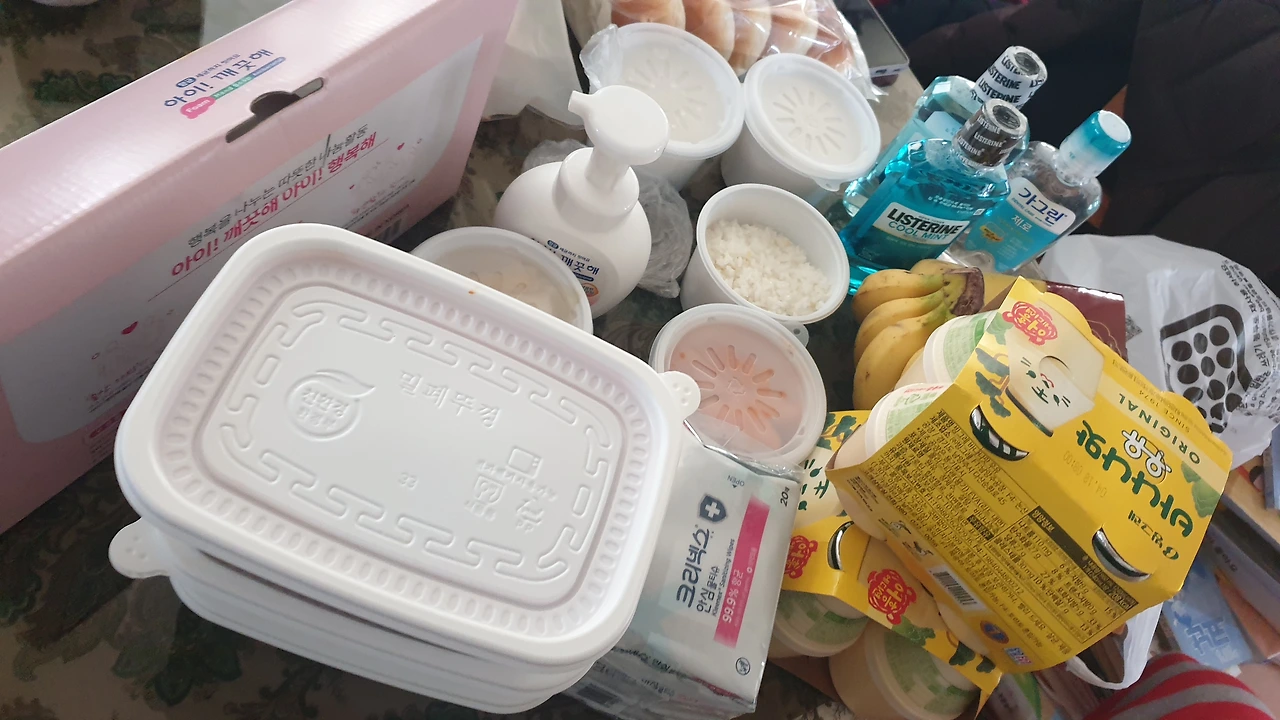 동생도 필요한 걸 보내준다고 해서, 육개장, 바나나, 가글, 물티슈, 바나나우유 등을 챙겨서 보내왔다.