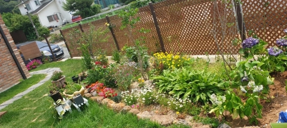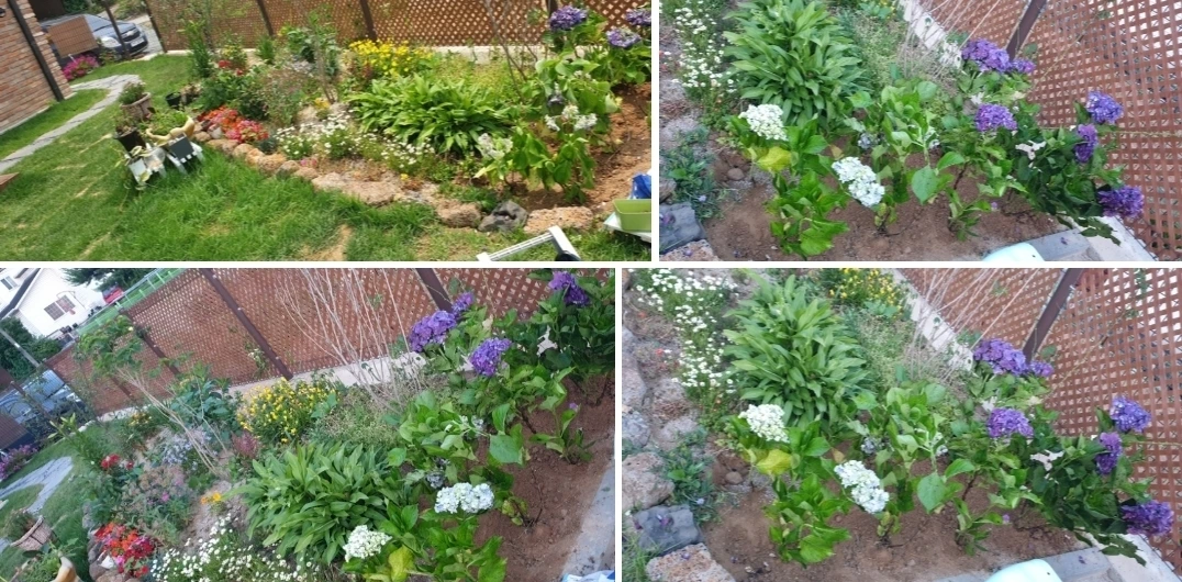 제주도에서 비행기 타고 온 알록달록 수국을 꺼냈다. 얼른 시들기 전에 수돗가 옆 화단에 줄을 세워 심었더니 꽃밭의 격이 순간 업그레이드가 된 듯했다.