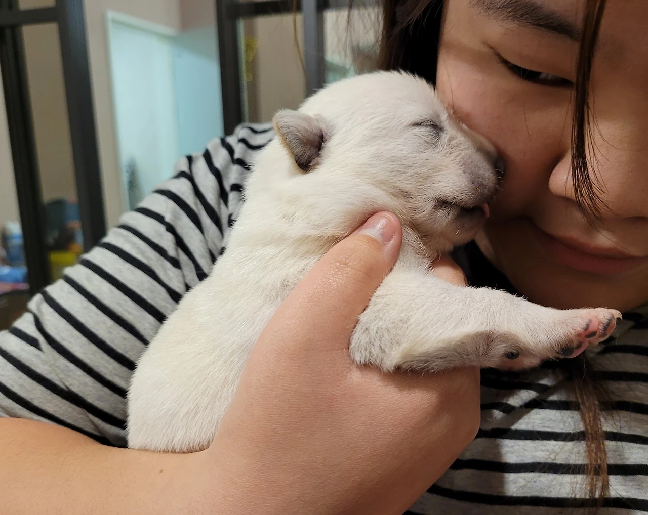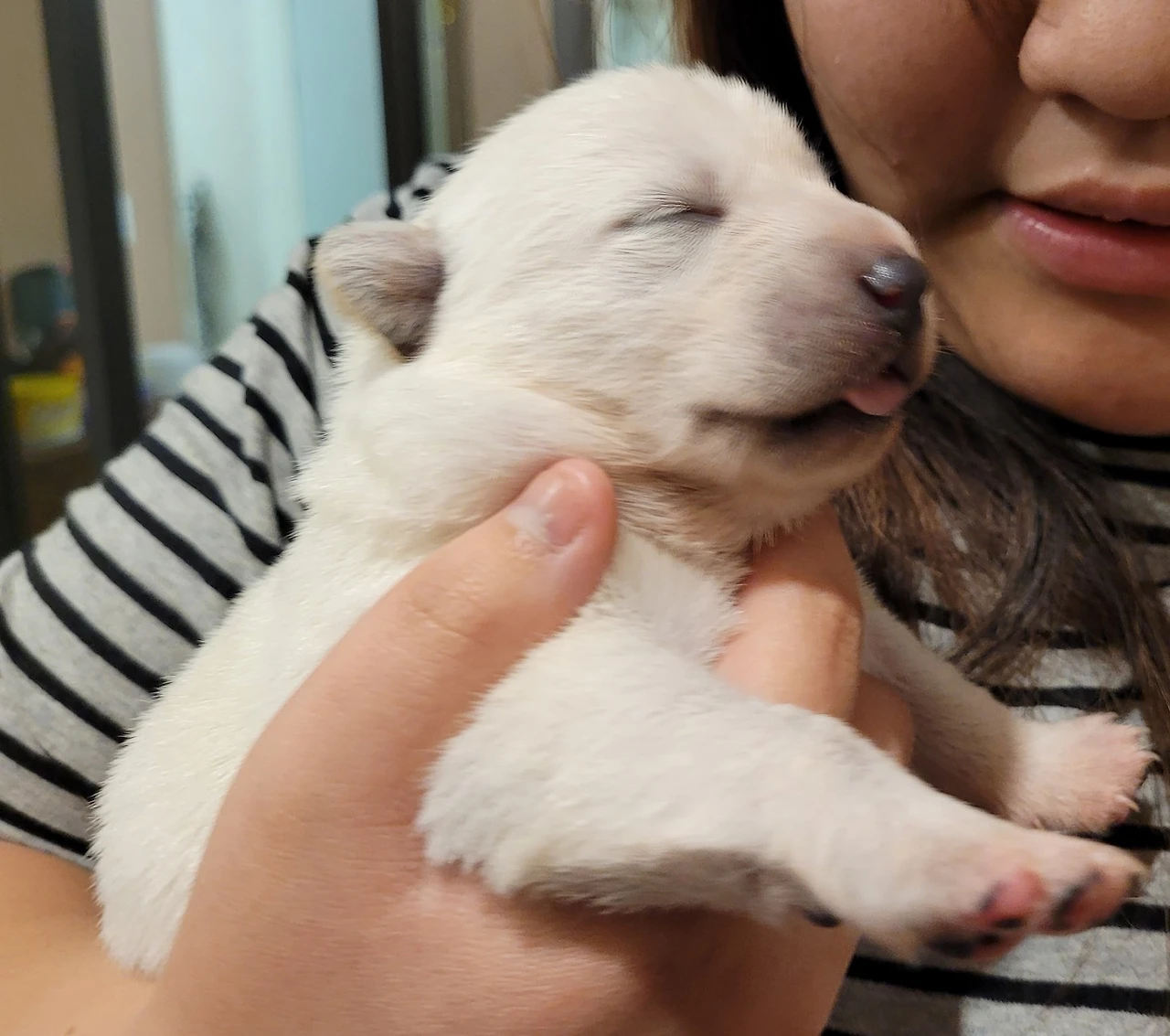 이제야 새끼 강아지를 손에 들어 안아 보는 딸.