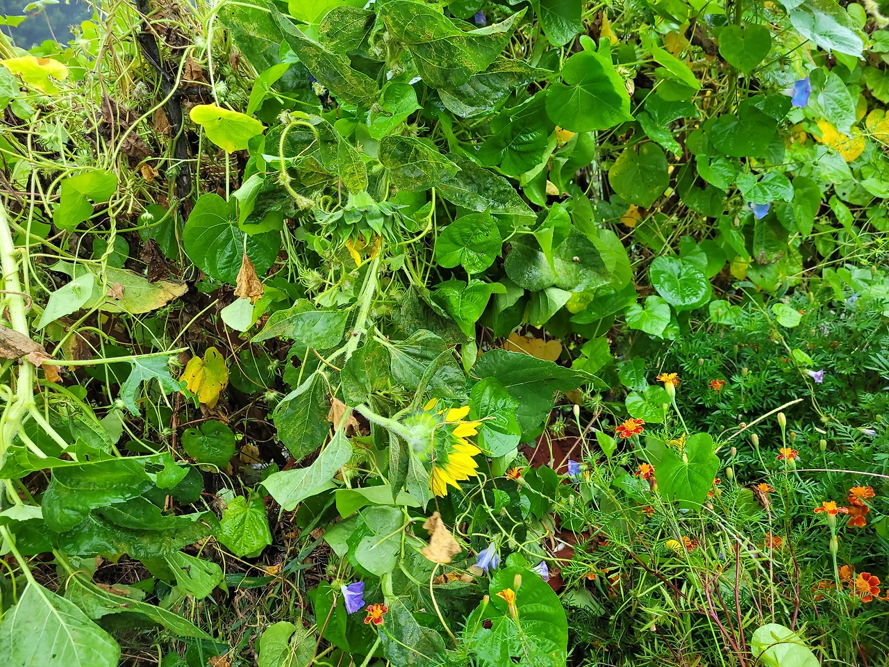 늦은 여름휴가를 다녀오고, 비가 내렸다. 얼마 동안 정원 관리를 제대로 못하고 방치해두고 말았다. 정원 정리를 해야 한다고 마음을 먹고 발길이 닿지 않던 울타리 쪽으로 향하고는 다시 한번 충격에 휩싸였다. 멀리서 보니 예쁜 나팔꽃들이 만발하여 예쁘다고 생각했었는데, 가까이 가보니 도저히 예쁘다 할 수가 없었다. 어느새 꺽다리 해바라기 꽃은 고개를 떨구고, 허리까지 푹 숙이고 있었다. 아니 고개를 바닥에 처박고 있었다. 한두 개 아니었다. 그 사이에 나팔꽃들이 해바라기를 칭칭 감고 또 감아버렸다. 해바라기가 도저히 견디지 못하고 몸을 숙이고 만 것이다.
