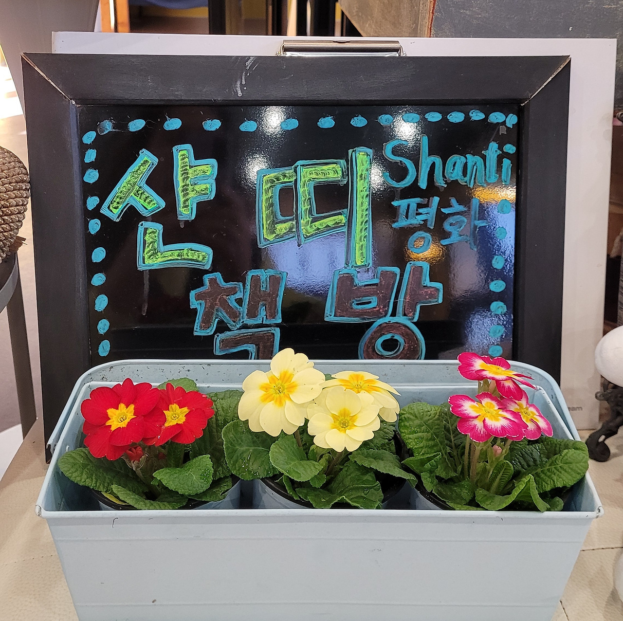 그리고 북카페 입구에 들어서면 오른쪽 '샨띠 책방'에 진열된 판매용 도서를 마주하며, 넷이서 앉을 수 있는 검은색 소파 세트가 놓여있다. 어르신은 항상 이 검은색 소파에 앉아 아이스 바닐라 라떼를 드신다. 그리고 나 아니면 남편이 튼튼한 원목 다리가 지탱하는 소파에 마주 앉아 어릴 적 할머니의 속주머니에서 줄줄이 끌려 나오는 달콤하고도 고소한 간식거리라도 되는 양 어르신의 이야기를 들으며 담소를 나눈다. 마치 경건의 시간을 갖는 것처럼.