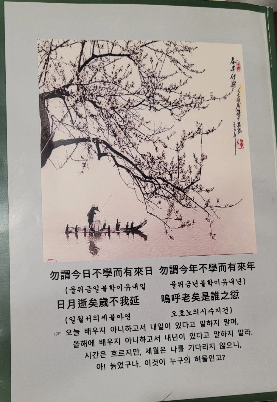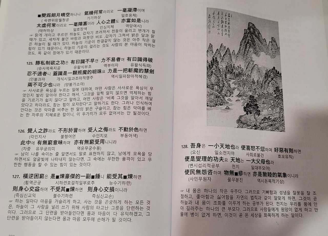 알고 보니, 향교 교장이셨던 어르신은 사자성어, 증광 현문, 채근담에 능하신 한학자 셨다. 그 많은 내용을 하나하나 정리하셔서 책으로 엮어 놓으신 것이다. 성균관에서도 오랫동안 교육을 받으셨다고 하신다. 결혼식 주례를 많이 서셨다는 말씀을 들었었는데, 이제야 앞뒤가 연결이 되어 단추가 꿰어지는 듯했다.