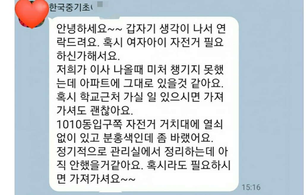 작년에 한국에 와서 아무것도 없었을 때, 자전거를 타고 가는 아이들을 보며 샤이니가 자전거를 타고 싶다고 조르기 시작했다. 보조바퀴가 없는 자전거를 한 번도 타본 적이 없는 아이에게 어떻게 할까 고민하고 있던 중 메시지가 하나 도착했다.