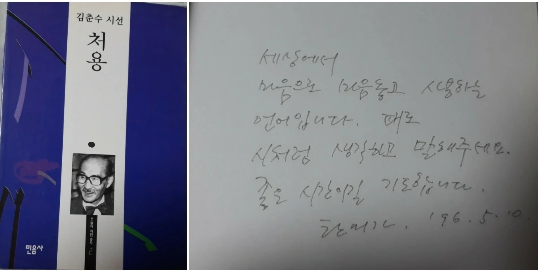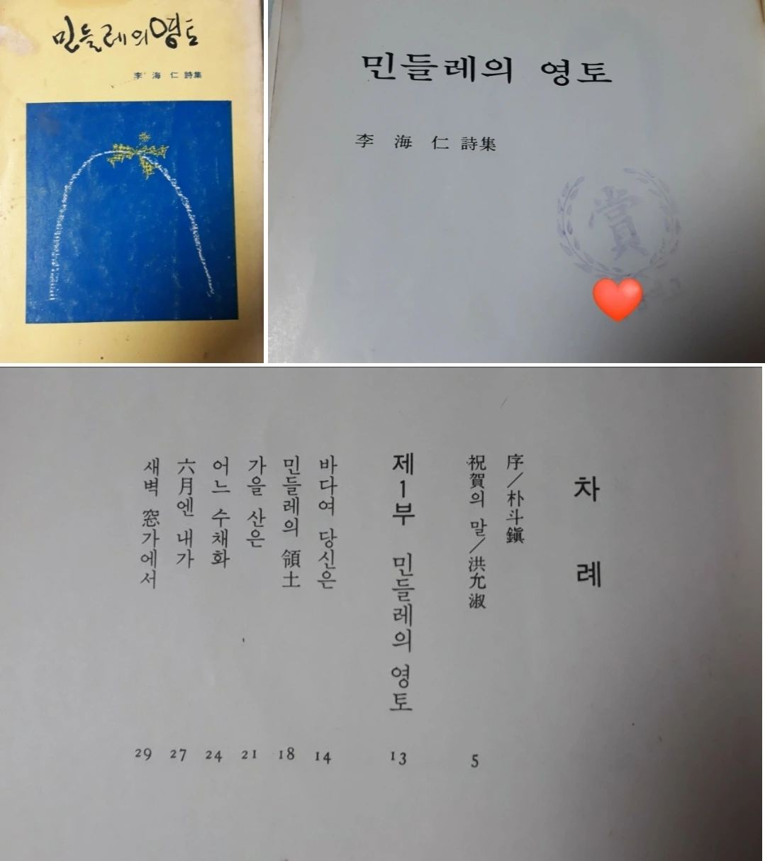 옆에 꽂힌 시집도 두 권 꺼내어 보았다. 한 권은 교내 백일장 대회에서 우수상으로 받은 시집 '민들레의 영토'다. 그리고 다른 하나는 친한 언니에게 선물 받은 시집 '김춘추의 시선 처용'이다.