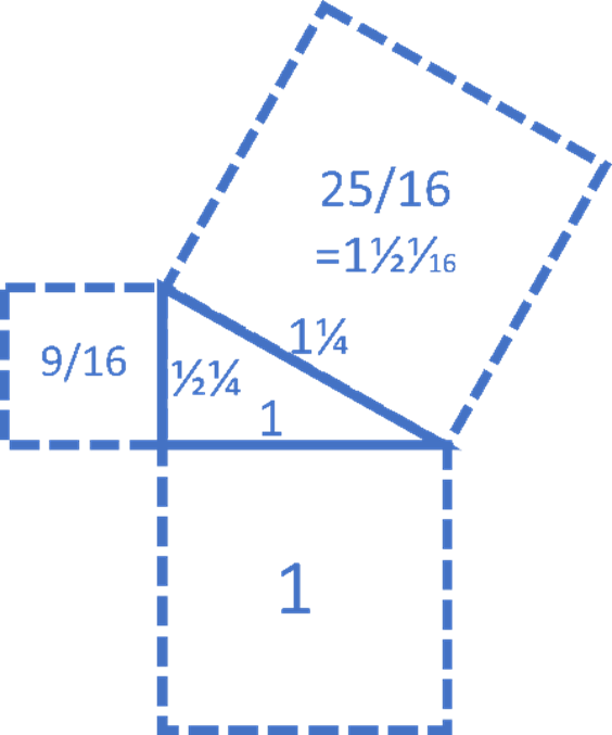 ❺ 두 정사각형의 넓이의 합은 ²⁵/₁₆ (=1 ½ ¹/₁₆) 입니다. 이 수치가 나오게 된 과정은 손상되어서 보이지 않는 것 같습니다. 여기서 ¼ 이라는 숫자가 잘못 추가되어 있는데 이것은 서기가 실수로 기록한 듯 합니다. 계속 이어서 이것의 제곱근은 1¼ 라고 설명하고 있고 지금까지의 과정을 그림으로 표현하면 다음과 같습니다.