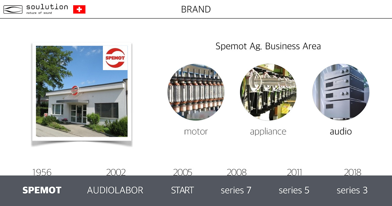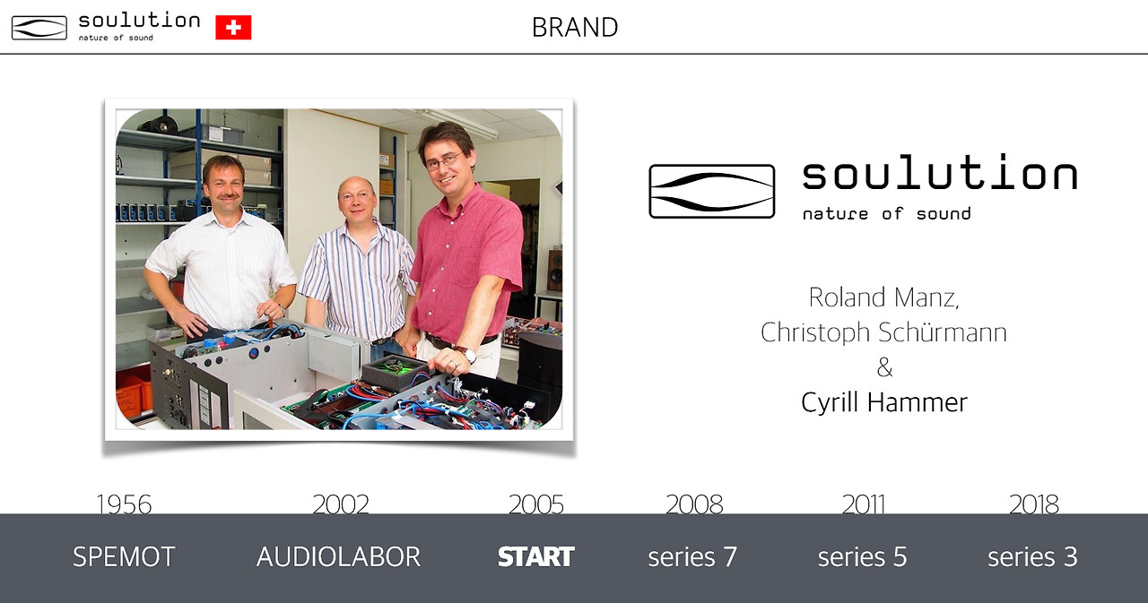스위스의 럭셔리 하이엔드 앰프 제조사, 소울루션이 처음 등장한 것은 2005년의 일이다. 이들의 모체는 수십년 동안 모터를 제작해온 스위스의 산업용 모터 제조 업체였다. 하지만 신사업으로 하이엔드 오디오를 선택하여 5년여의 새로운 앰프 회로 개발 끝에 내놓은 것이 소울루션의 창립 작품인 7시리즈 프리 앰프와 모노 블록 파워 앰프였다. 물론 모터 제조사가 아무런 배경 없이 갑자기 억대의 초고가 앰프를 내놓은 것은 아니다. 모터 제조사인 모기업 수페모트(Spemot AG)의 오너이자 소울루션의 사업의 창업주인 회사의 대표 시릴 하머는 하이파이와 음악 마니아로 90년대 중반부터 'Audio Labor'라는 독일 오디오 브랜드를 수입, 판매하는 부업이 있었다.