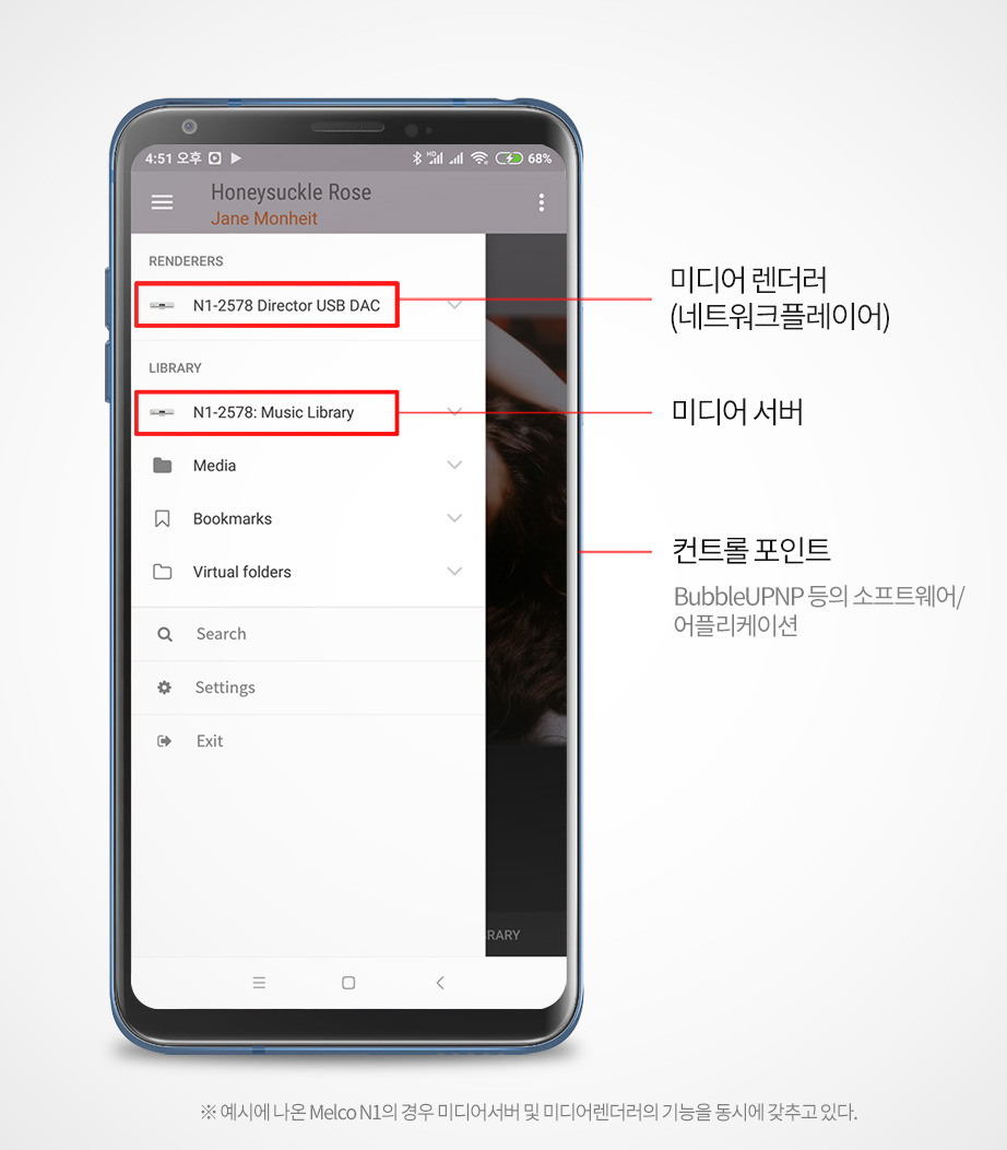 즉, 실제 소비자가 자신이 구입한 네트워크 플레이어를 눈으로 보고 느끼게 되는 인터페이스 역할을 하는 것이 바로 이 컨트롤 포인트 앱들입니다. 검색이 쉽고 간편하며, 파일의 정보를 보여주고, 재생이 쉽고 원활하게 되도록 해주는 앱 일수록 사용자는 그 네트워크 플레이어를 좋은 기기로 평가합니다. 네트워크를 통한 미디어 재생 과정에서는 사용자가 과거 CD나 플레이어의 리모컨처럼 실체를 만질 수 있는 것이 하나도 없습니다. 유일하게 사용자에게 경험을 제공하는 것이 이 컨트롤 포인트 역할을 하는 앱 뿐입니다. 그래서 앱의 인터페이스가 뛰어날수록(즉, 편리하고 쉬운 사용자 경험을 안겨줄수록) 뛰어난 네트워크 플레이어로 평가합니다. 사실 플레이어는 재생만할 뿐 이런 플레이어의 음질이나 성능과 무관하지만 말이죠. 하지만 사용자들은 앱이 곧 플레이어라는 생각을 하는 분이 많습니다.