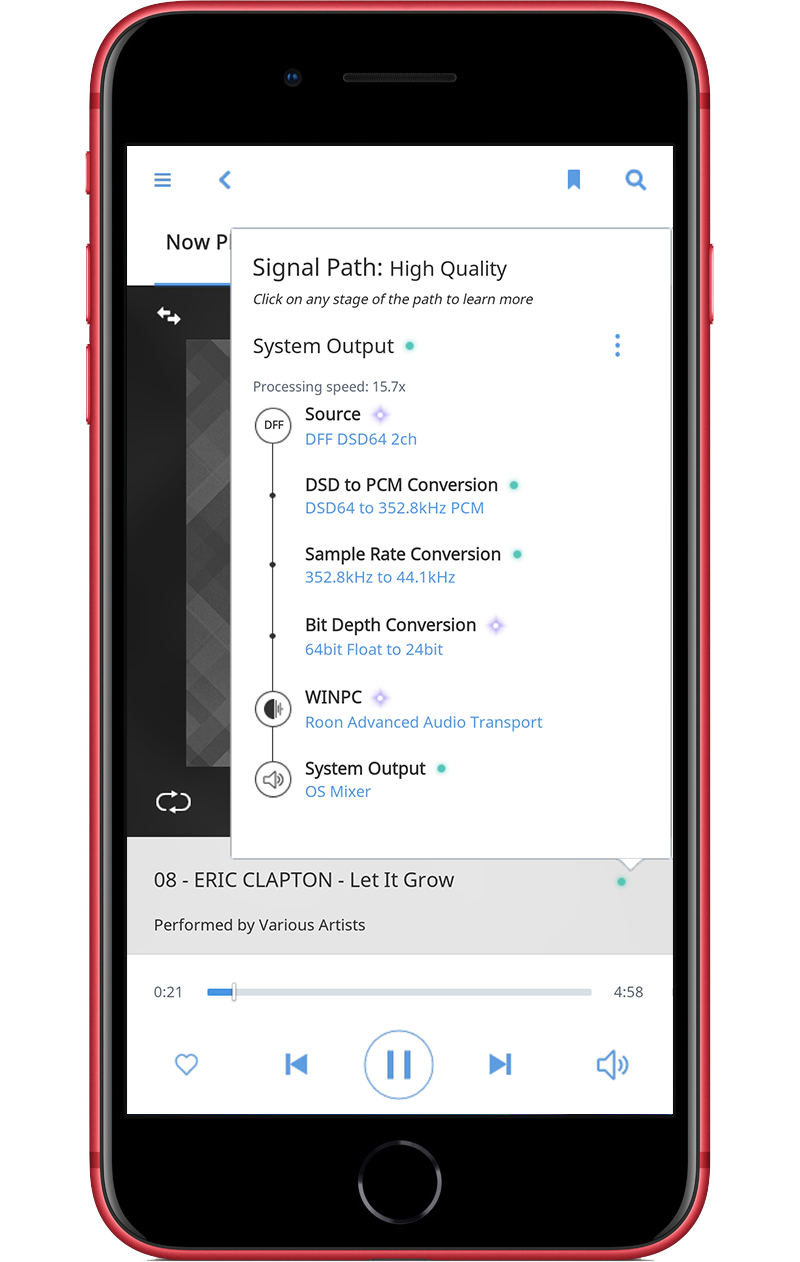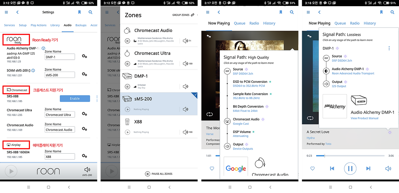 게다가 오디오파일들에게는 매우 인상적인 기능 중 하나가 재생되는 단계별 상태를 보여주는 ‘신호 경로(Signal Path)’ 기능이 있습니다. 이는 기기마다 재생되는 음악의 신호 상태를 보여주는 기능으로, 재생되는 음악의 샘플링 레이트와 비트수를 원래 음원 파일부터 최종 미디어 플레이어에서 재생까지 개별 단계마다 신호의 변화를 보여줍니다. 즉, 오리지널 파일 그대로 전송되는 지 아니면 중간에 하드웨어에 맞춰서 DSD를 PCM으로 바꾸거나 또는 샘플레이트를 고해상도에서 일반 해상도를 낮추는 것을 어느 기기가 어느 단계에서 동작하고 있는지도 알 수 있습니다.