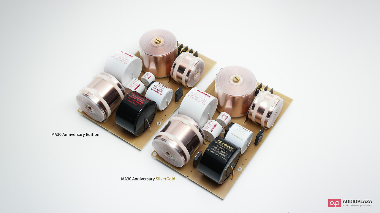 MA30 실버골드는 애니버서리 에디션에 비해 달라진 점이 크게 2가지다. 크로스오버 필터 회로에 사용된 콘덴서 2개를 실버골드 등급으로 교체한 것이다. 5.6uF의 MCap Supreme Evo SilverGold Oil과 8.2uF의 MCap Evo SilverGold Oil이 새롭게 콘덴서의 자리를 차지하게 되었다. 수프림 에보 실버골드의 경우, 콘덴서 1개당 가격이 애니버서리 에디션에 사용된 콘덴서보다 20만원이나 더 비싼 부품임을 감안하면 원가의 차이와 음질적 차이가 어떨지 쉽게 상상이 될 것이다. 이 외에도 실버골드 에디션에는 스피커 내부의 흡음 및 댐핑 소재로 사용된 솜이 엔젤 헤어라 부르는 별도의 울 소재로 교체되었다.