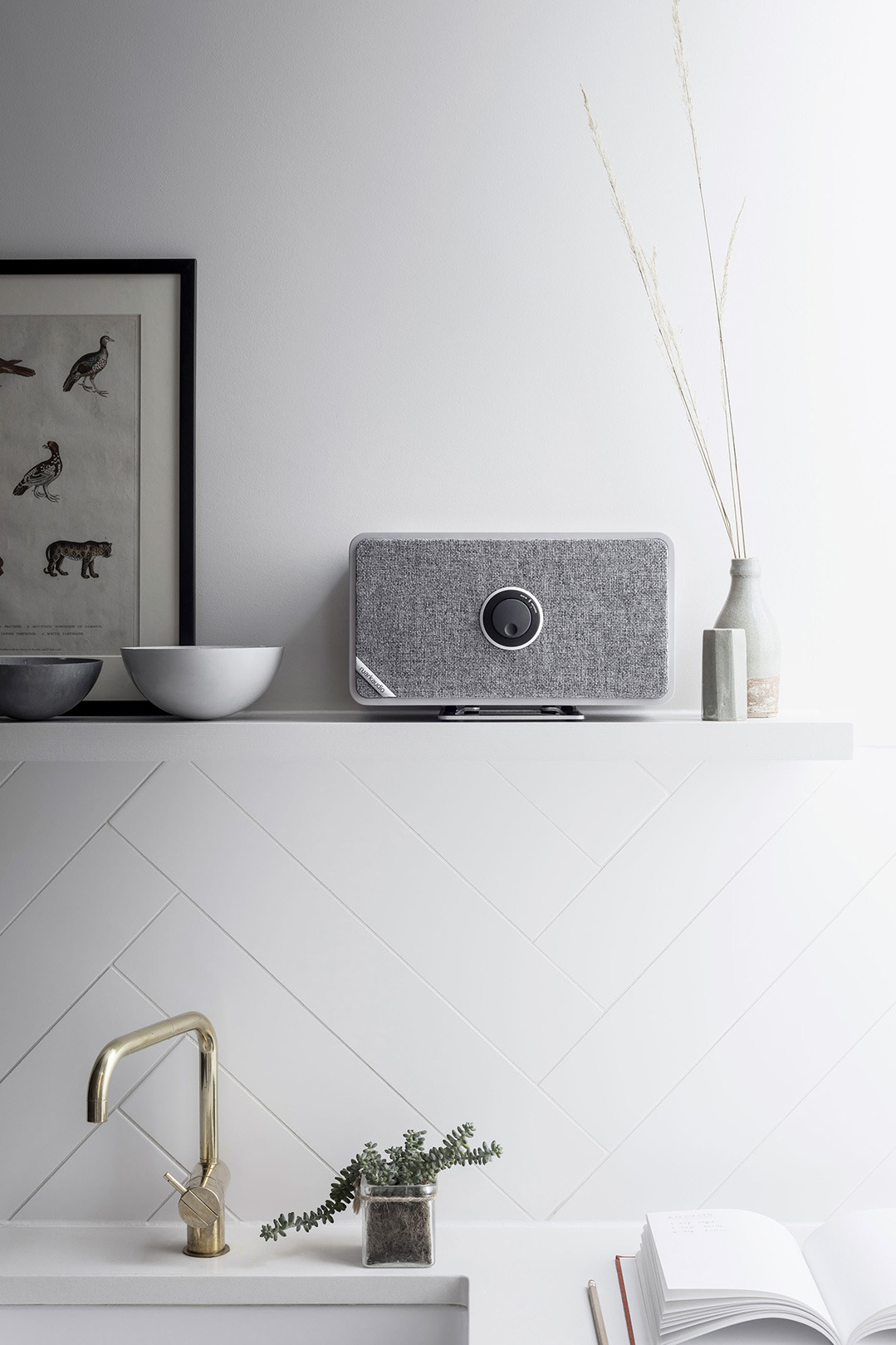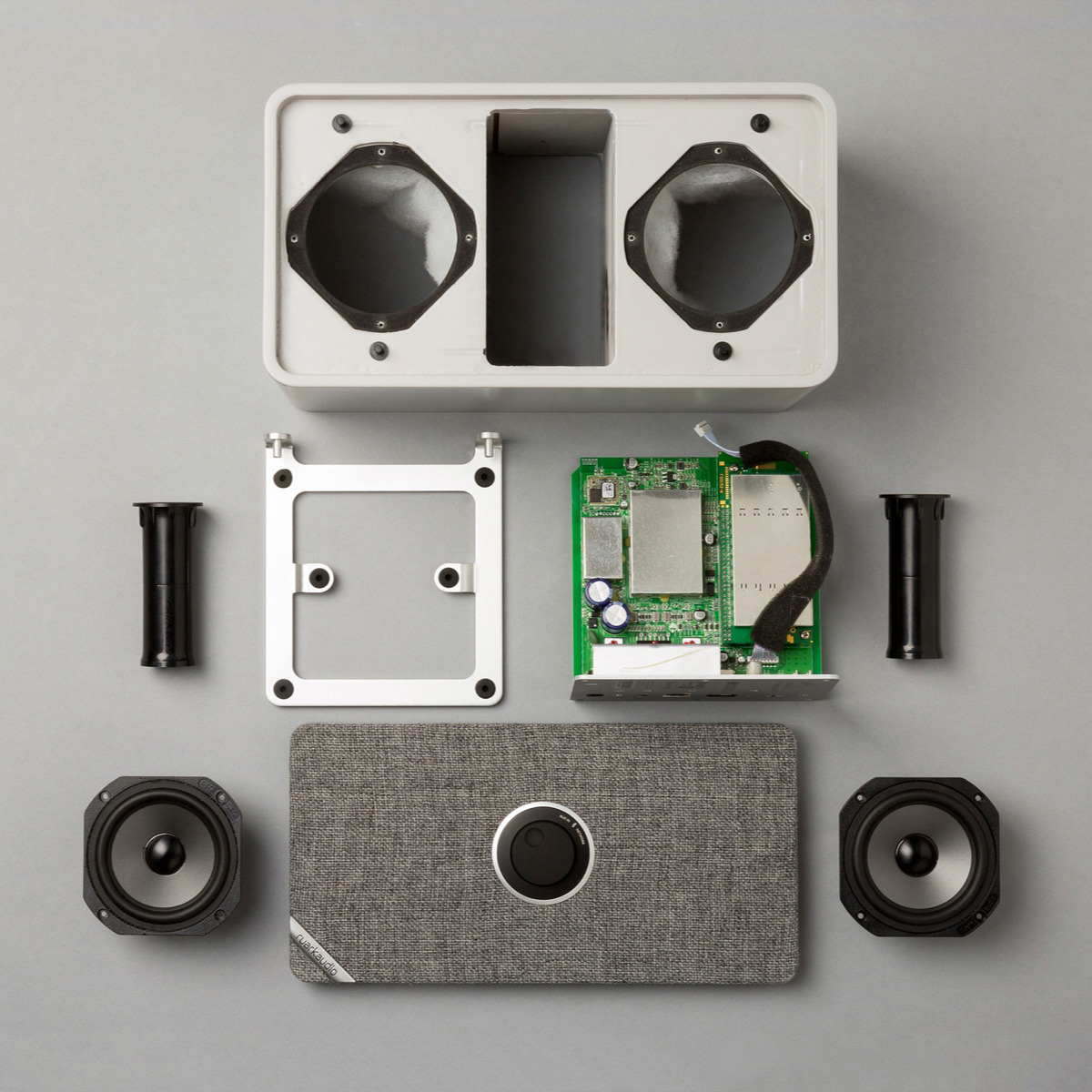 전면을 제외한 모든 면면들은 나무 소재 캐비닛으로 제작되어 있는데, 리얼 우드 마감으로 마무리 되어 마치 60-70년대의 빈티지 오디오 내지는 텔리푼켄 진공관 라디오 같은 느낌을 준다. 하지만 훨씬 더 현대적이고 세련되며 라운드진 모서리는 충분히 가정 인테리어에 고급스러운 오브제 역할을 더해준다. ‘리치 월넛’ 원목 마감은 레트로풍의 분위기를, ‘소프트 그레이’는 도회적 분위기를 선사한다. 두 마감 모두 전면에는 패브릭 소재의 그릴이 덮혀 있는데, R5와 마찬가지로 영국의 섬유 원단 전문 디자인 업체인 카미라(Camira)가 제작한 패브릭 모직물을 사용했다. 단, 그릴은 탈부착 방식은 아니라서 직접 교체는 불가능하다.