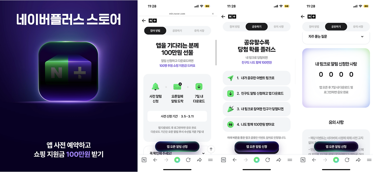 사전예약은 게임업종에서 많이 진행했었는데 라이브쇼핑과 같은 커머스에서도 많이 쓰이고 이번 네플스 앱 마케팅에도 사전예약 방식을 활용했네요. 바이럴 효과를 얻기 위해 추천인 이벤트도 진행했습니다.