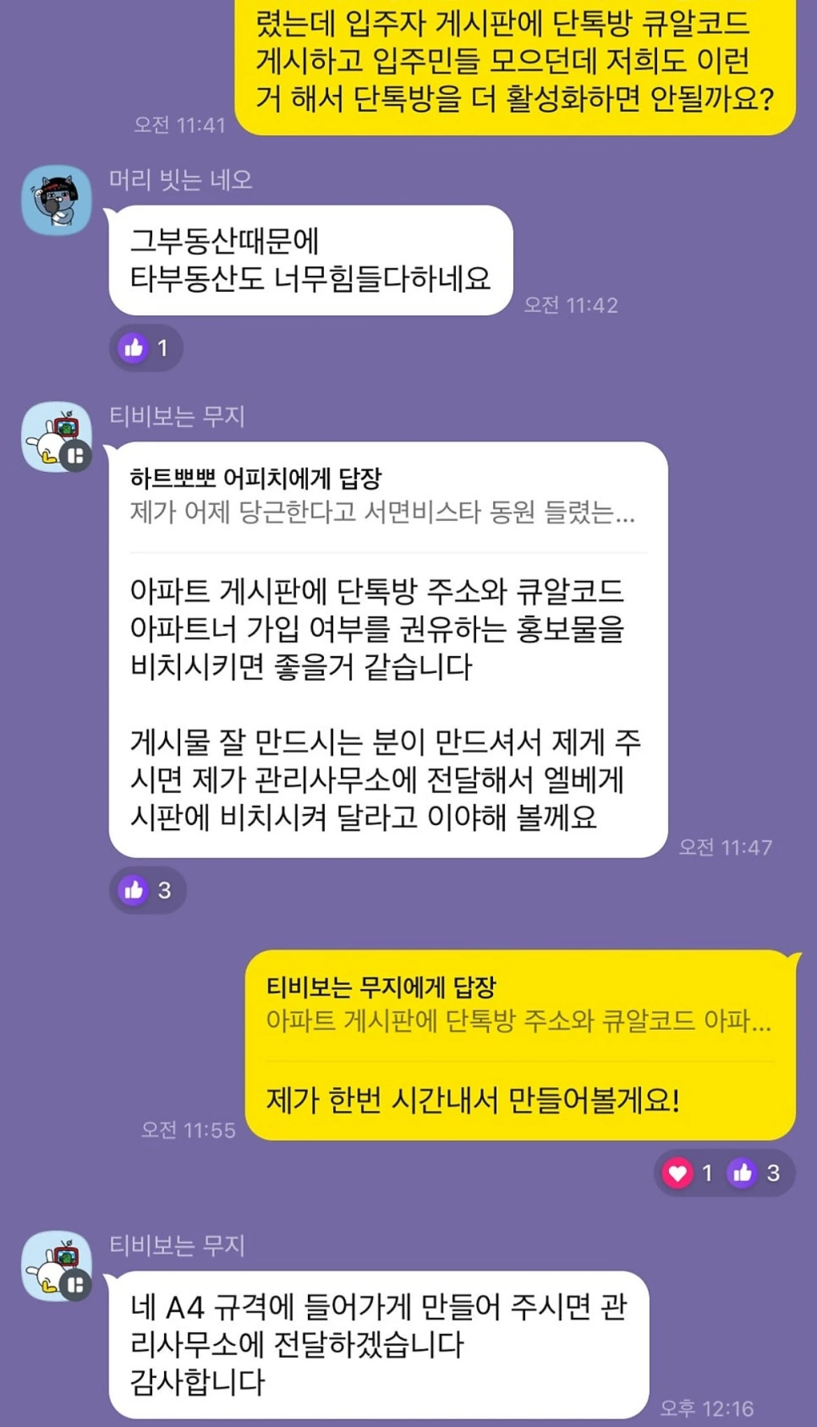 2. 우여곡절 끝에 이삿짐을 정리하고, 아파트 단체 카톡방에 입장했습니다. 입주민들이 어떤 의견을 주고 받는지 한참동안 지켜보는 재미에 저 역시 그 당시 꽤나 적극적이었나봅니다.
