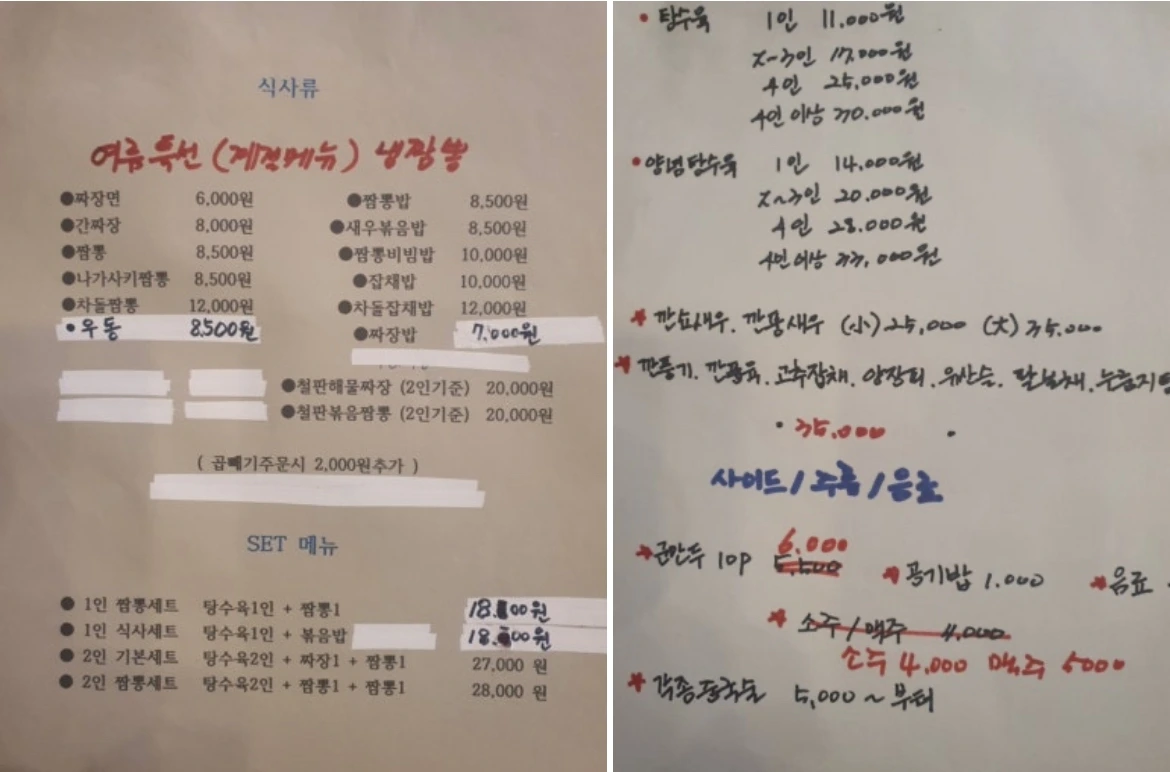 출력물 위에 화이트로 수정한 자국과 매직으로 적은 메뉴판은 고객에게 좋은 인상을 주기 어렵습니다. 화이트보다는 중화요리 전문점의 대표 색상인 붉은 색을 바탕색으로 추천드렸습니다.