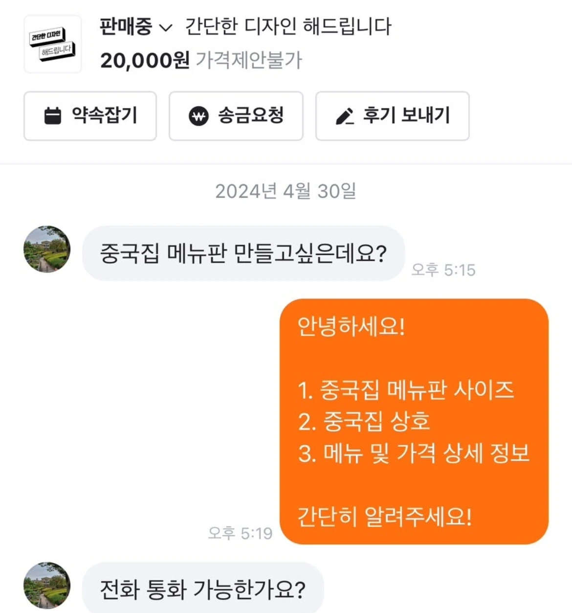전화 통화로 얻은 정보는 ‘흰 종이에 매직으로 적은 메뉴판을 변경하고 싶다’가 전부였습니다. 문의를 주신 분의 요청사항이 디테일하지 않았습니다. 크몽, 숨고와 같이 비용을 지불하고 서비스를 제공받는 어플로 제게 의뢰하신게 아니기 때문입니다.
