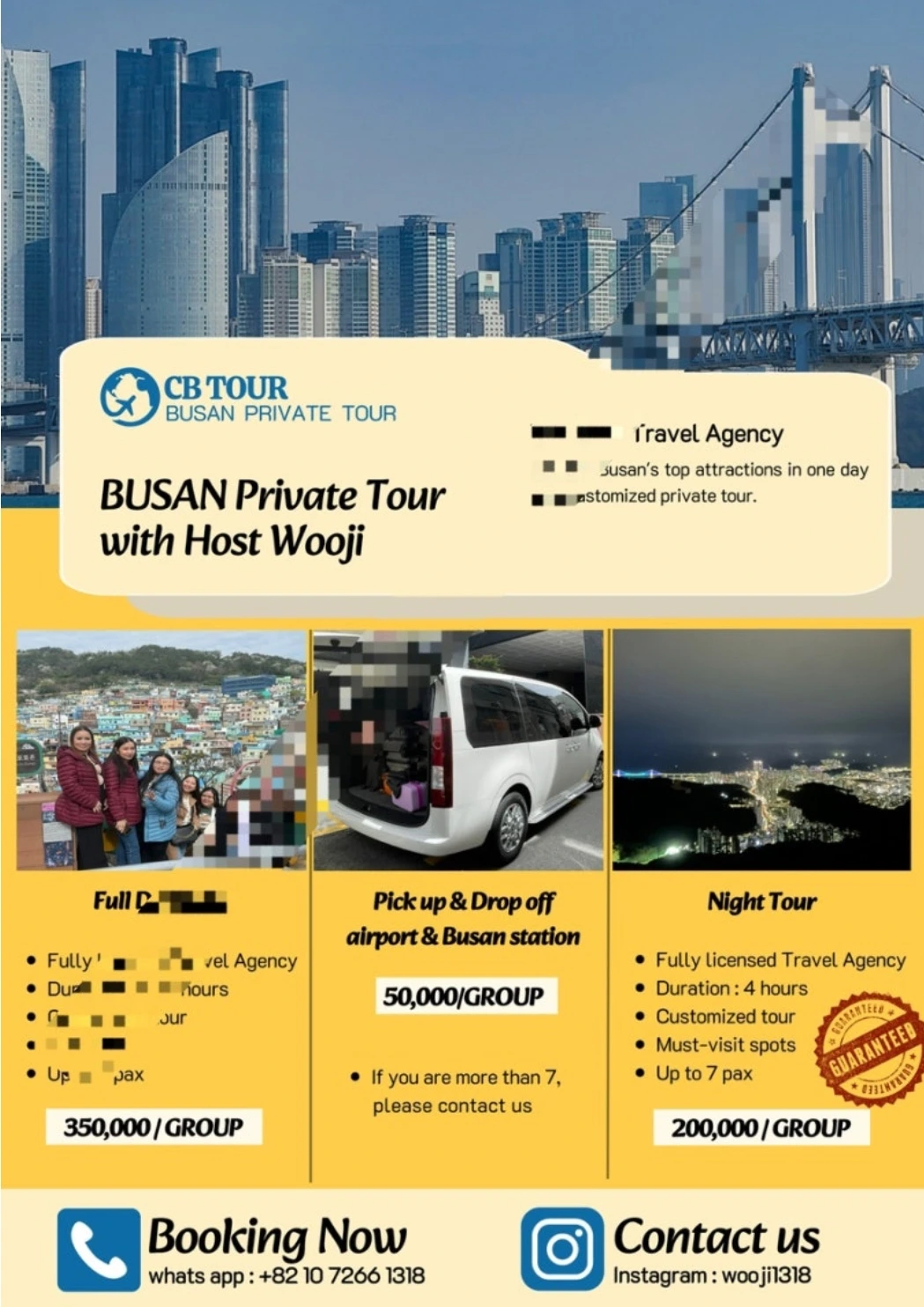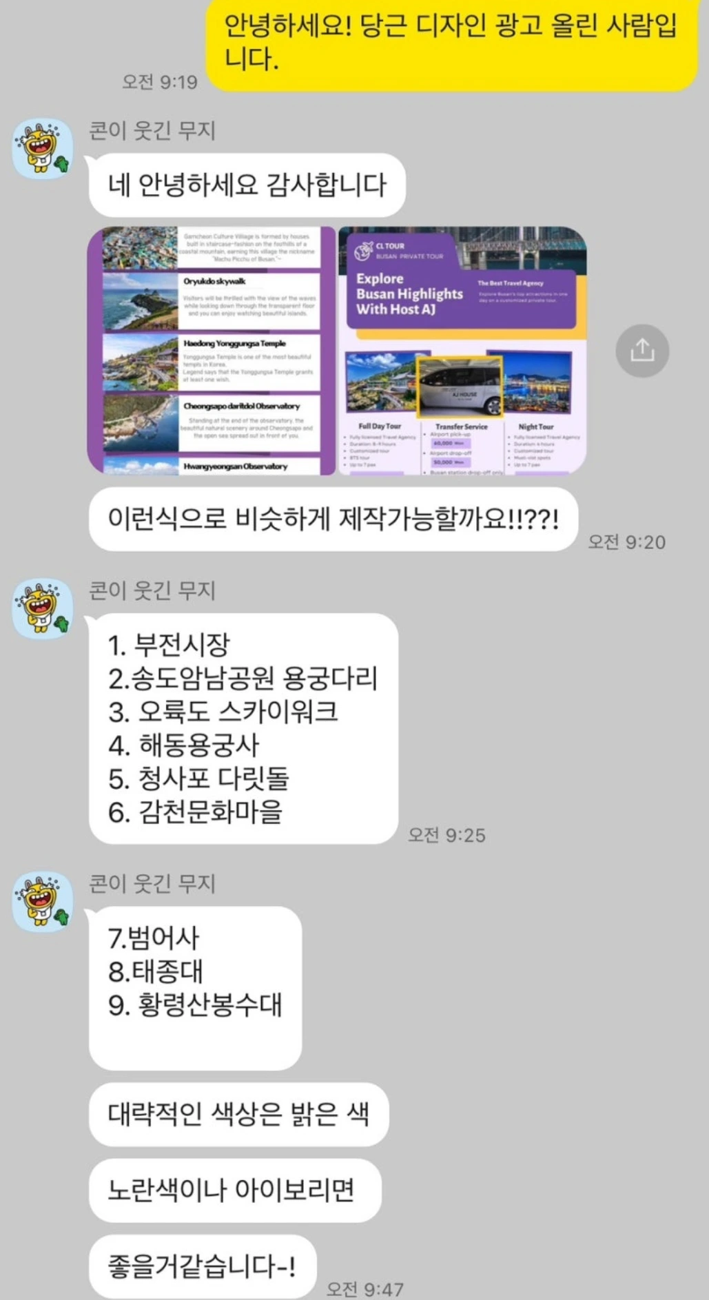 2. 고객님은 부산에서 외국인을 대상으로 여행 가이드 사업을 하시는 분입니다. 디자인 예시자료를 먼저 충분히 제공해주신 덕분에, 작업이 수월했습니다. 원하시는 색상도 명확했습니다.
