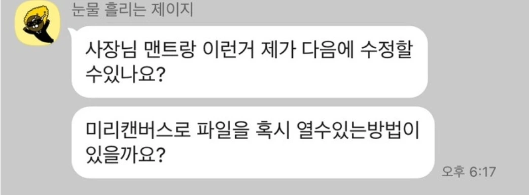 8. 가끔 완성된 작업물을 구매확정 이후에 수정이 기능한지 물어보는 고객님들이 계십니다. 물론, 가능합니다. 미리캔버스에 특정 게시물에 대한 수정권한을 부여해드리면 언제든지 수정할 수 있으니 걱정마시기 바랍니다. 잔금을 받고난 후에 수정 링크를 발송해드리고 이번 작업도 마무리지었습니다.