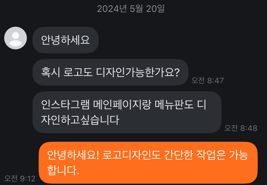 1. 클래스 101에서 로고디자인 강의를 들은지 고작 3주, 여전히 툴 사용방법이 서툰 제게 연락이 왔습니다. 저의 첫 로고디자인 의뢰입니다. 그저 <간단한 로고디자인 작업이 가능합니다> 라는 조심스레 올려둔 홍보글에 손내밀어주신 것에 감격받았습니다.