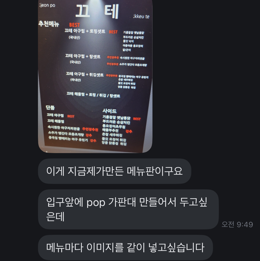 하지만 현실적인 벽에 부딪혔습니다. 메뉴판 하나를 위해 모든 메뉴를 한꺼번에 요리하고 촬영할 순 없었기에, 사장님은 음식이 나갈 때마다 틈틈이 핸드폰을 들어 사진을 찍어 보내주셨습니다.