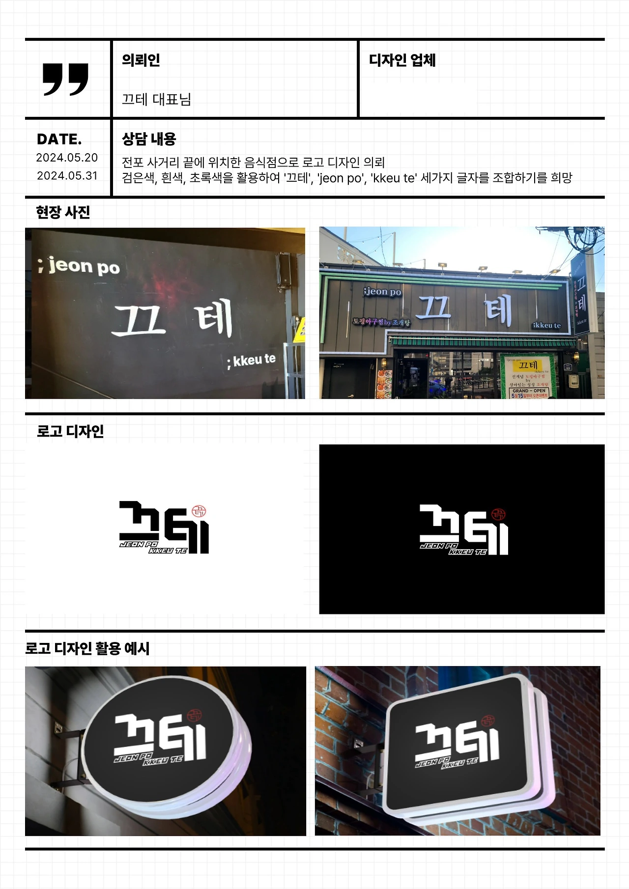 사장님은 고민 끝에 가게의 얼굴인 간판을 그대로 로고화하고 싶어 하셨습니다. 나아가 언젠가 '망원 끄테', '성수 끄테'처럼 동네의 이름을 품은 프랜차이즈로 확장될 미래까지 꿈꾸고 계셨습니다. 누군가의 소중한 꿈이 담긴 'xx끄테' 시리즈의 첫 단추를 제가 끼우게 되었습니다.