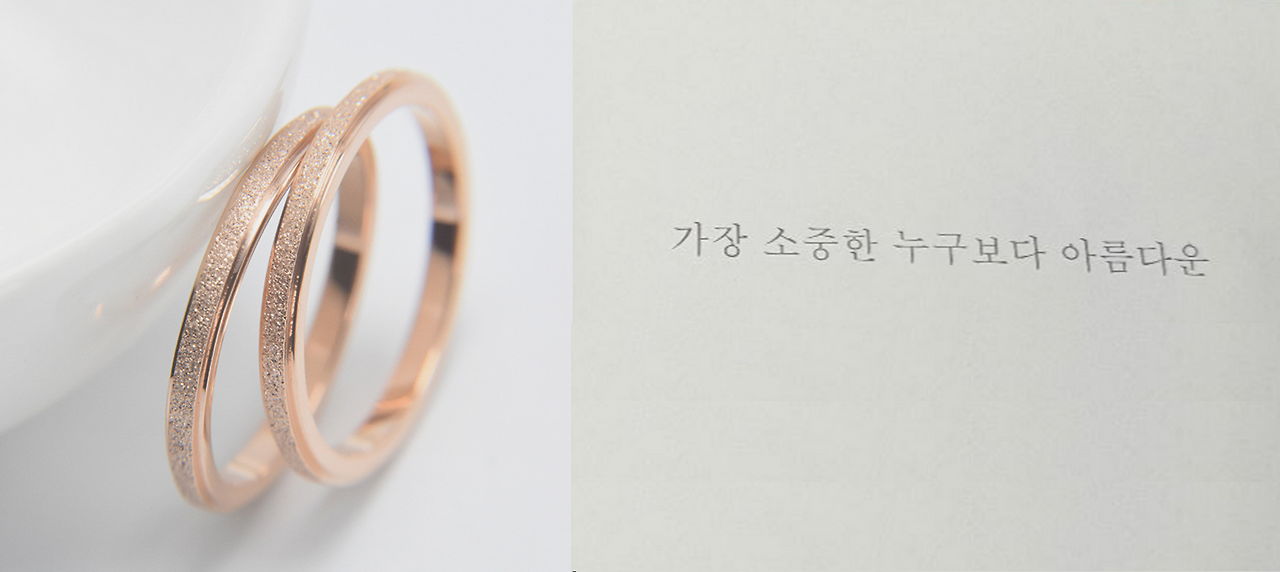 그래서 앞으로 살아갈 날엔, 오늘 손뼉 치던 이들이 보이지 않는 그날엔, (막 10:7) 이러므로 사람이 그 부모를 떠나서 혼인서약에 메이고 정금 같은 믿음에 메이라고 핑크빛이 감도는 반지를 준비했다. 그렇게 애틋한 내 마음을 전해보았다