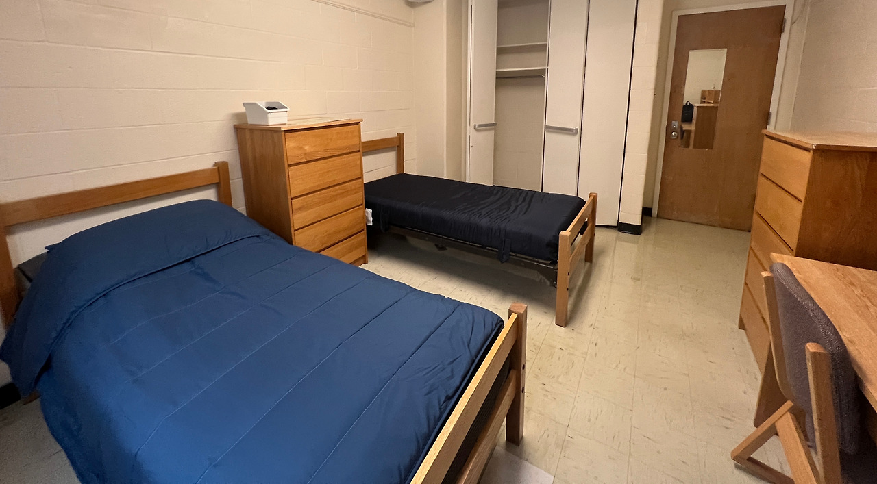 (선풍기나 에어컨이 없는 벽돌로 지어진 오래된 기숙사 정말 작은 싱글침대와 서랍장 책상 옷장이 전부다)