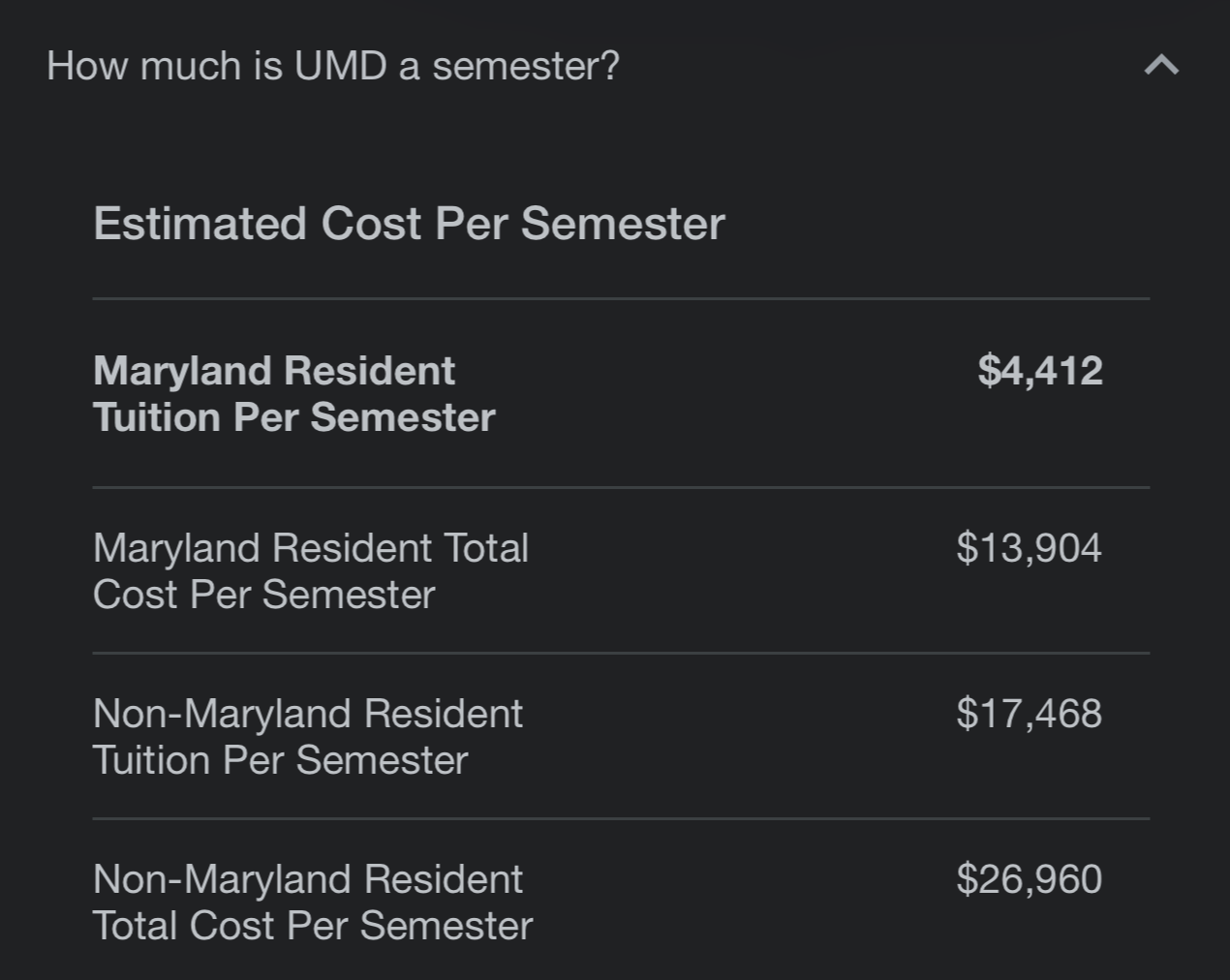 (2022년 9월 메릴랜드 대학의 out state 한 학기 등록금 여기에는 기숙사 및 식비 미포함)