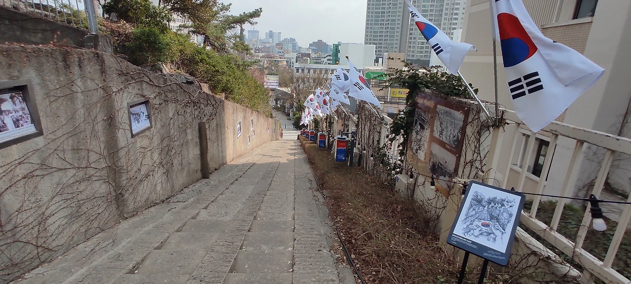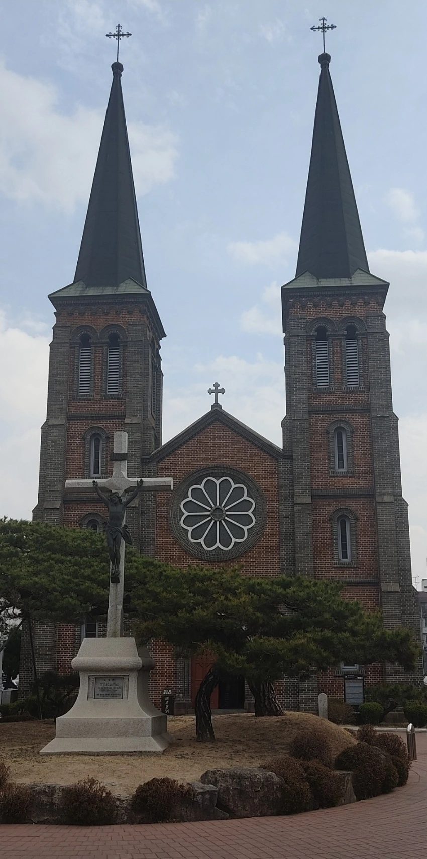 태극기가 예쁘게 꽂혀있는 아주 오래된 계단을 내려오니, 더 오래되어 보이는 멋진 성당이 가슴 벅차게 기다리고 있다.