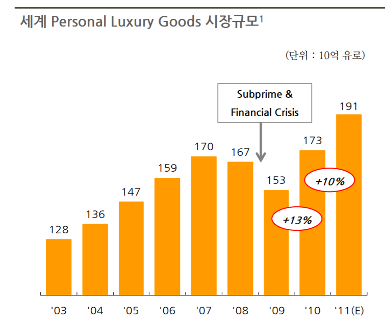 실제 전 세계 럭셔리 판매규모는 2007년 170억유로에서 153억유로로 크게 하락했죠. 전 세계적인 불황이니 비싼 제품을 사지 않는 것이 어쩌면 당연합니다.