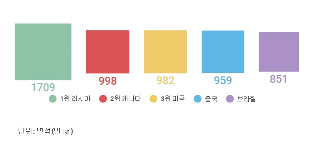 가장 넓은 땅을 가진 나라는 1709만 km²인 러시아가 1위이고, 뒤를 이어 캐나다, 미국, 중국, 브라질 순이다. 한국(남한)의 면적은 99,720 km²로 전 세계 순위로 보면 109위이다. 면적이 1위인 러시아의 0.58%(남한의 171배), 2위인 미국의 1.01%(남한의 92배)이다.