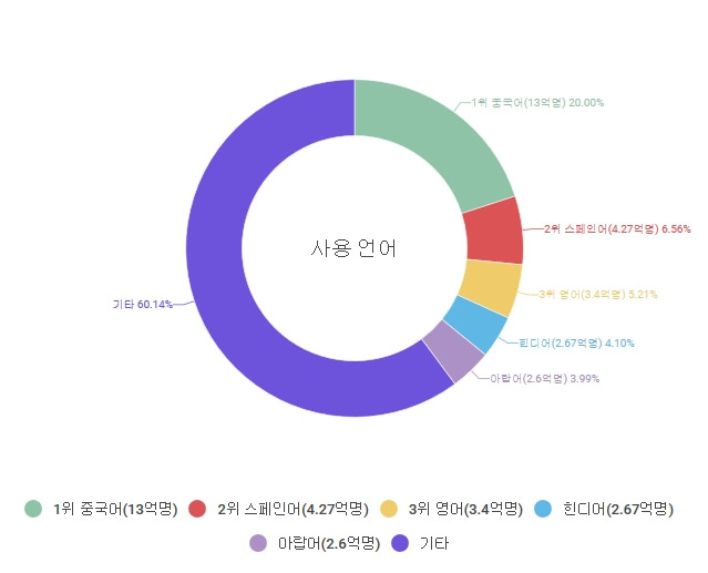 영어를 제일 많이 쓸 거 같지만 영어의 사용자 수는 3억 4천만 명으로 3위(5.21%)이다. 하지만 사용하는 나라 수로 보면 영어가 106개 나라로 1위이고, 아랍어가 58개 나라로 2위이다. 한국어는 북한, 중국, 일본 등에 총 7개국의 사용자수를 다 포함해 약 7,730만 명으로 12위이다.